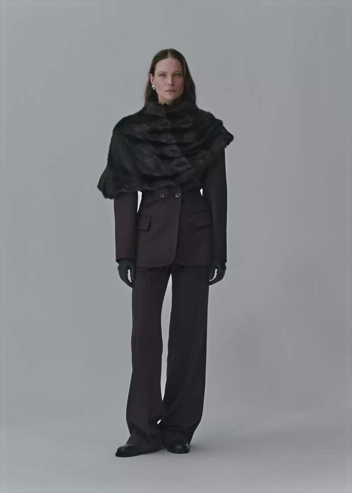 An asymmetrical faux fur wrap featuring soft volume and elegant draping across the left shoulder. Fastens at the neck with two discreet hook-and-eye closures and is fully lined with silk.