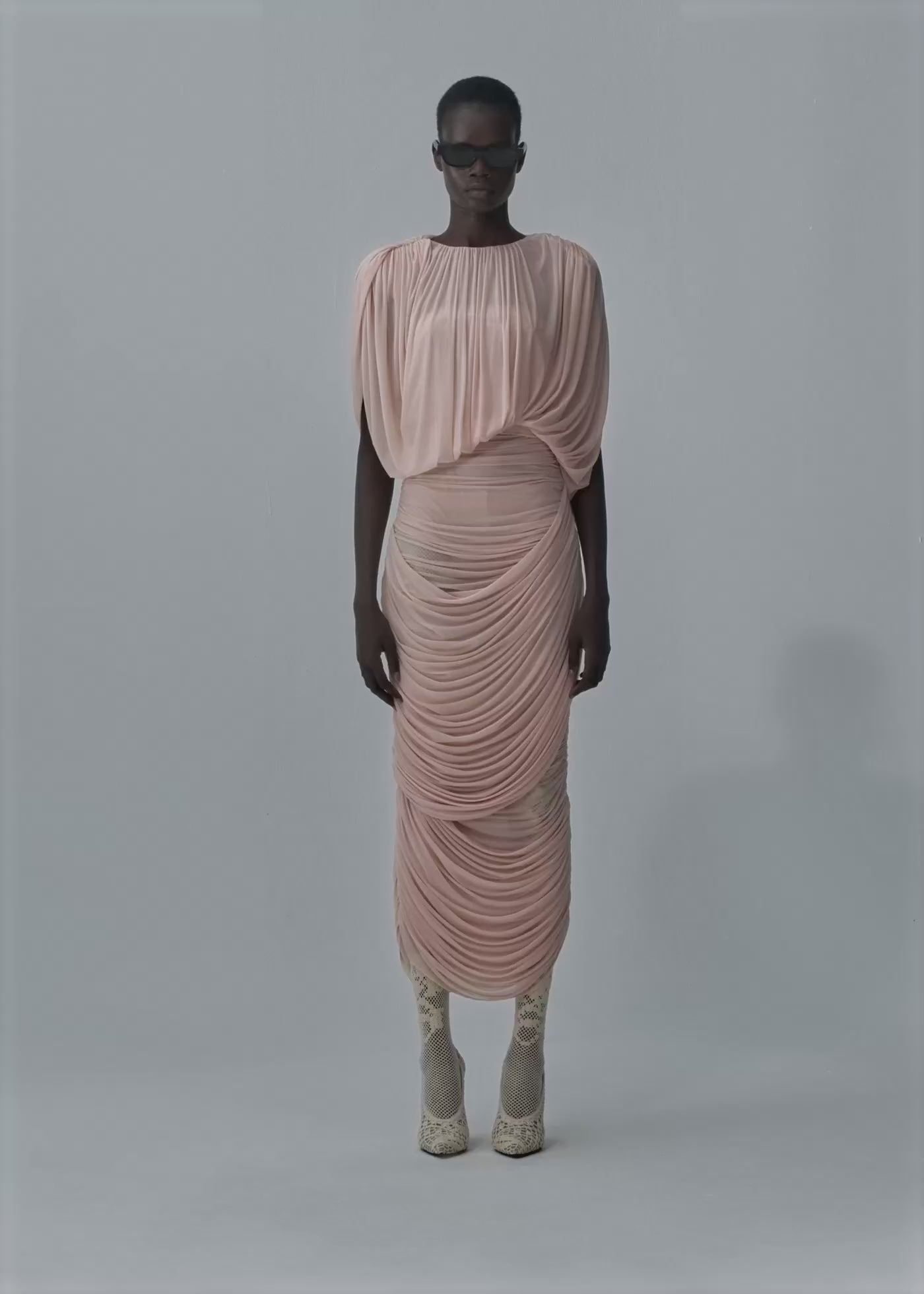 This midi dress is made from draped cupro that hugs the body to create a flattering silhouette. With ruching throughout and a strapless neckline, it is a sleek yet romantic evening option. For a shoulder-covering look, pair it with the matching draped blouse from the collection.