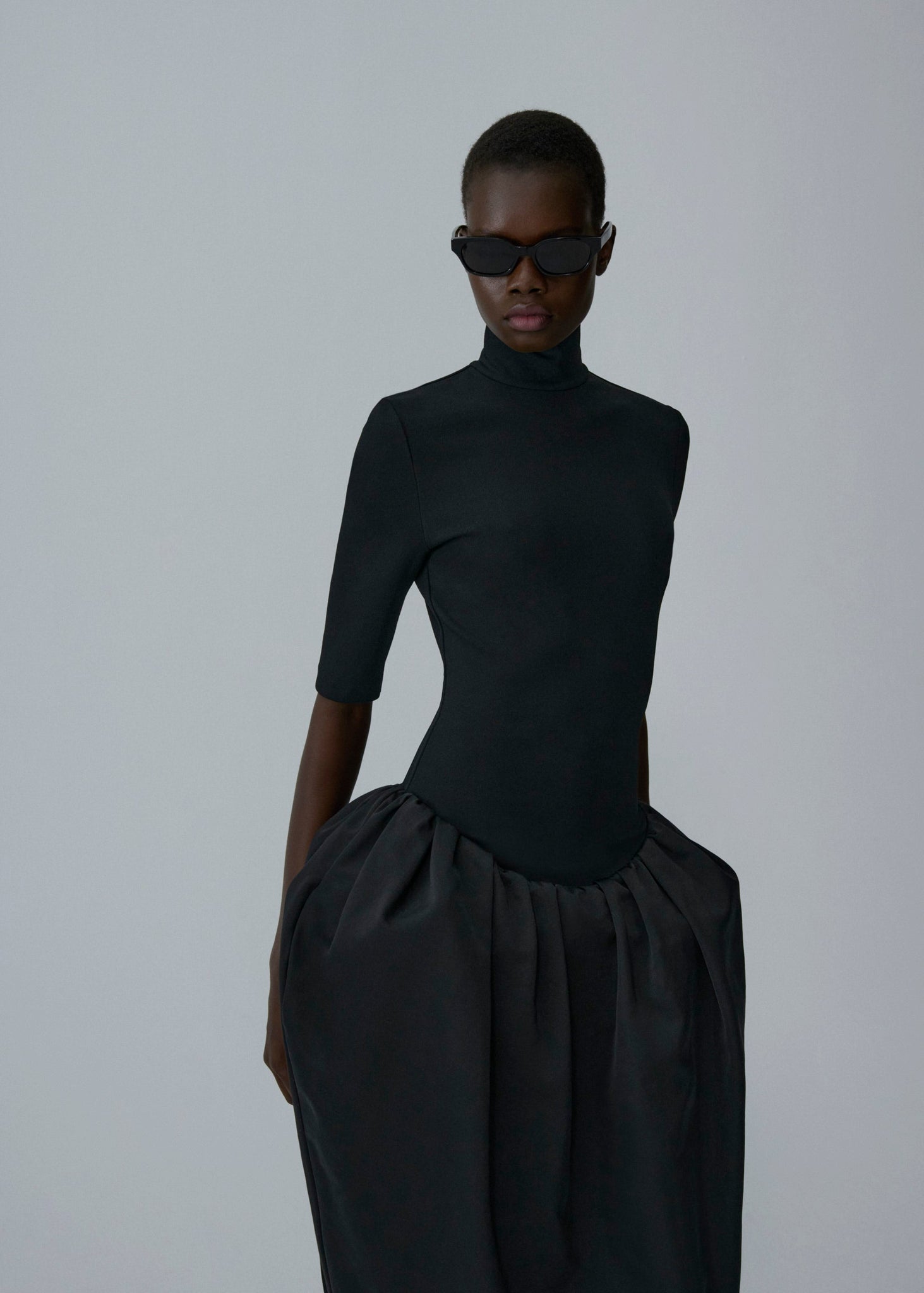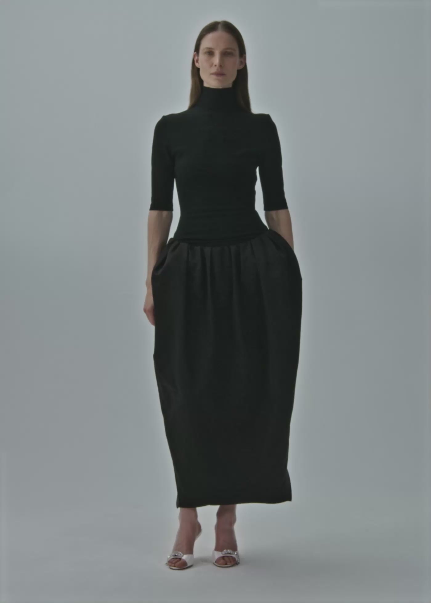 A form-fitting midi dress that combines a structured silhouette with dramatic volume. It features a sleek turtleneck and fitted 3/4 sleeves, contrasted by a voluminous skirt with a high slit at the back. The bodysuit base fastens underneath the skirt.