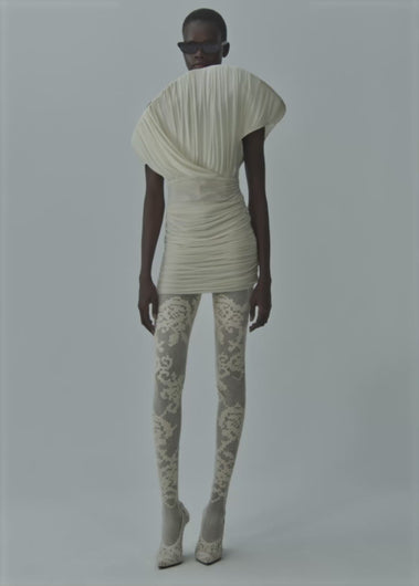 A standout piece of the collection, this sculptural mini dress features a dramatic fan-like draped front that flows into a one-shoulder silhouette. Crafted with Magda Butrym’s signature gathered detailing, the body-hugging fit is created through intricate ruching across the torso and hips. A bold yet elegant evening option that captures the essence of the brand’s modern femininity.
