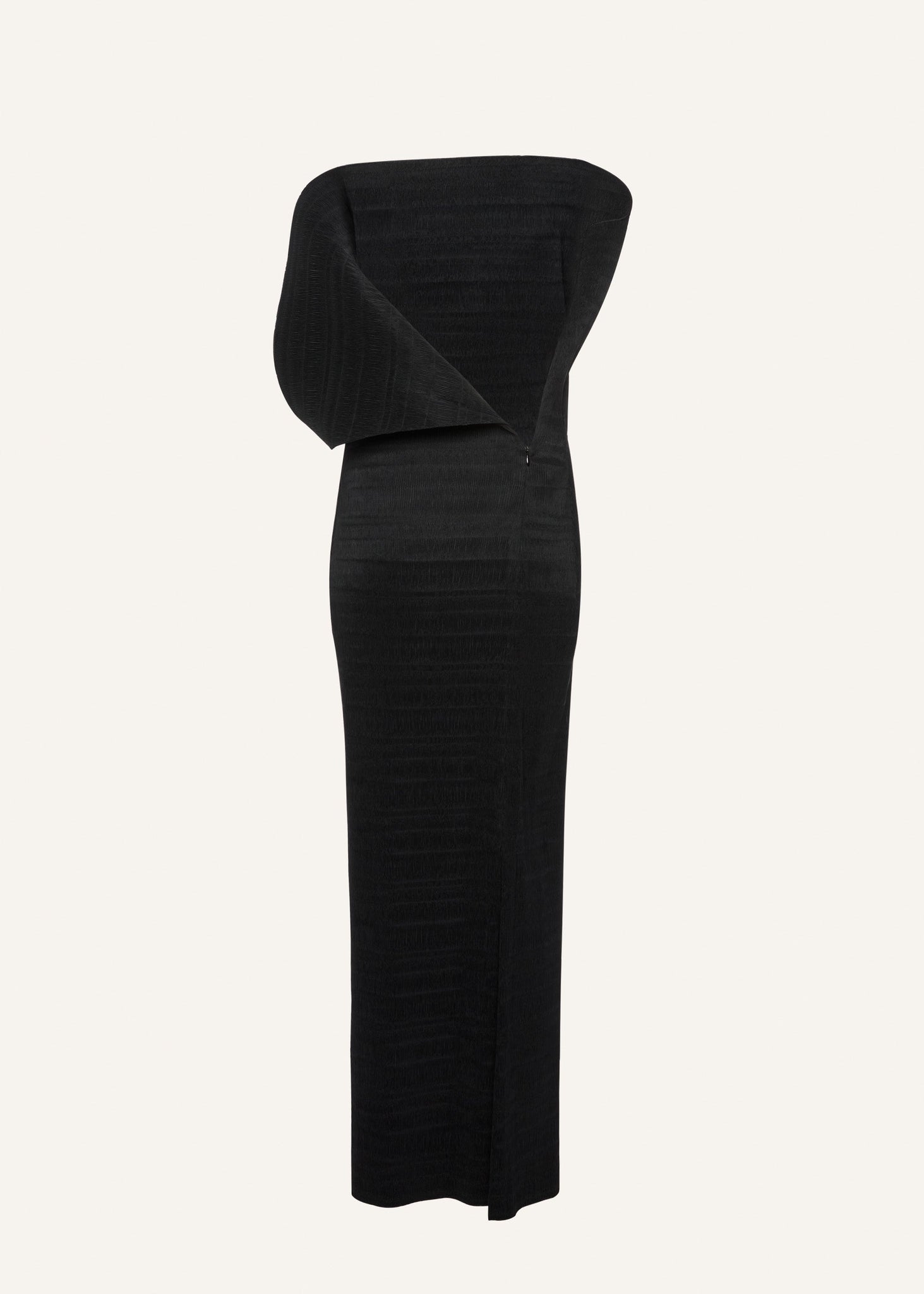 A narrow, ankle-length dress with sculptural silhouette. The design features a dramatic asymmetrical structure at the bodice with a wide, elevated neckline and open back down to the waist. Deep pleats contour the front, creating dimensional shape, while the internal waistband is secured with lingerie-style closures for added support. The dress fastens with a concealed zip at center back, finishing with a slit below for ease of movement.