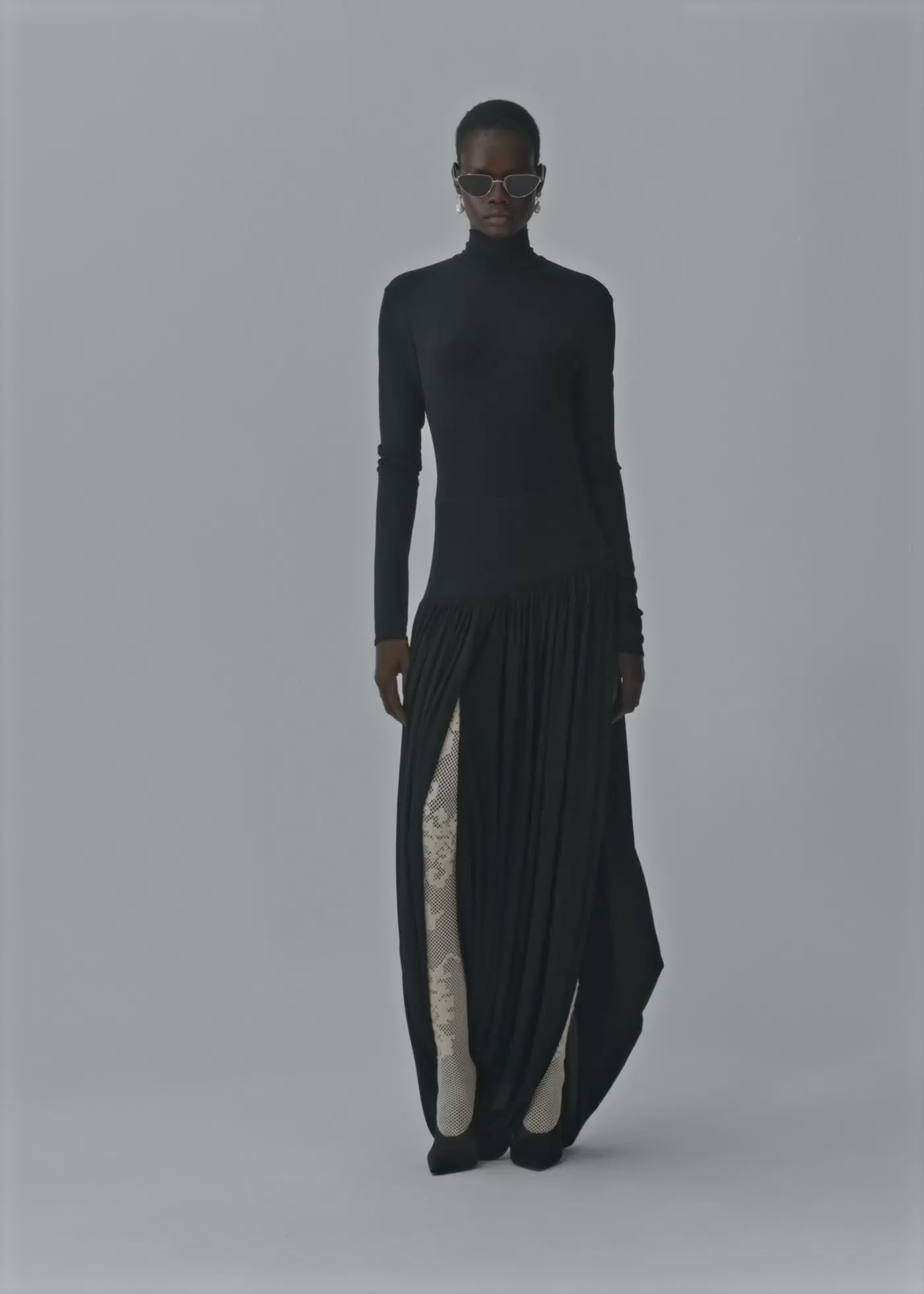 A long, figure-hugging gown with a high turtleneck collar and full-length sleeves. The sleek silhouette is contrasted by a voluminous draped skirt gathered at the hips, featuring open panels along the front and sides that add movement and a subtle reveal. Crafted with a stretch bodice and a lightweight draped lower half for a modern, fluid finish. Closed at the back with an invisible zip.