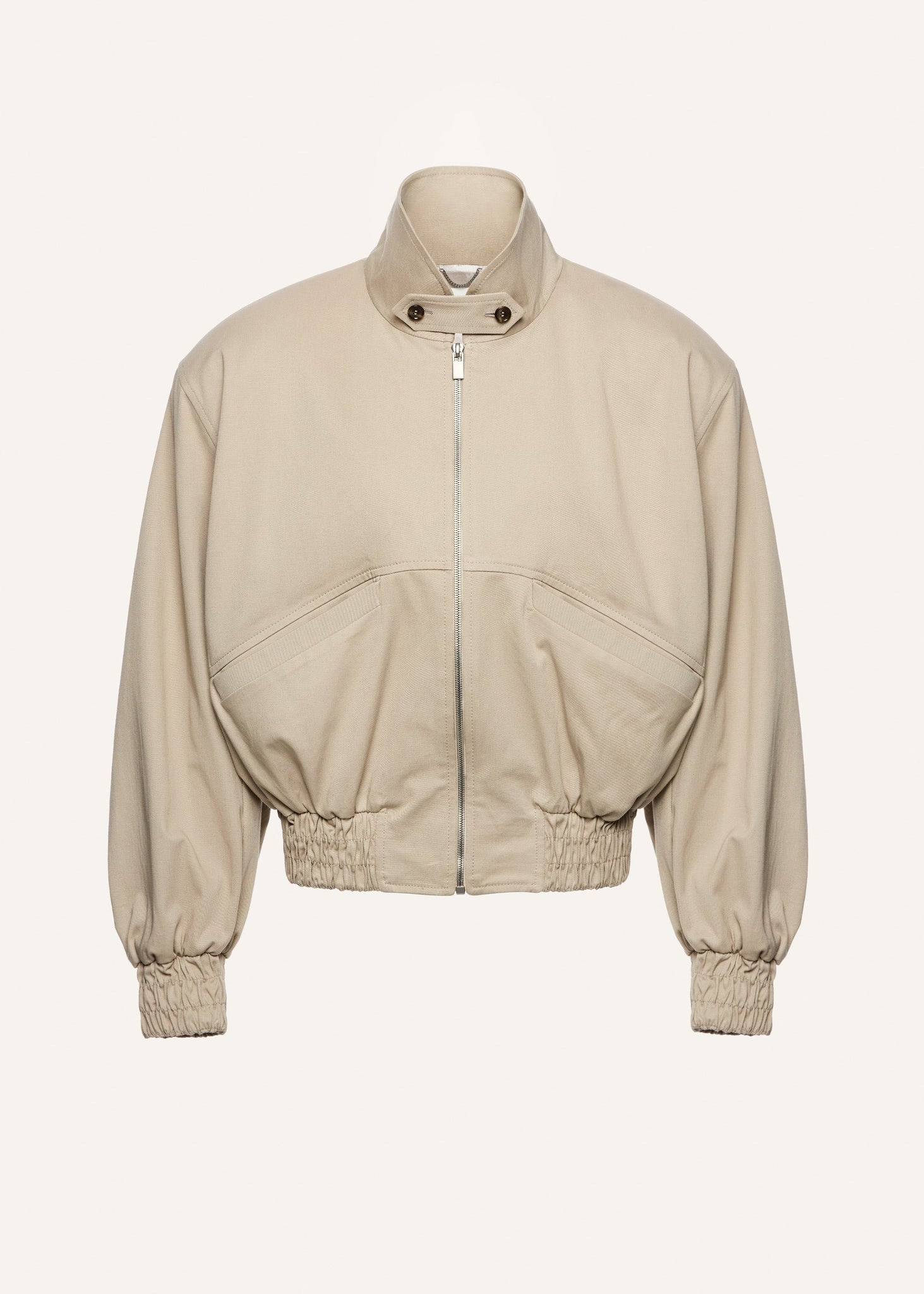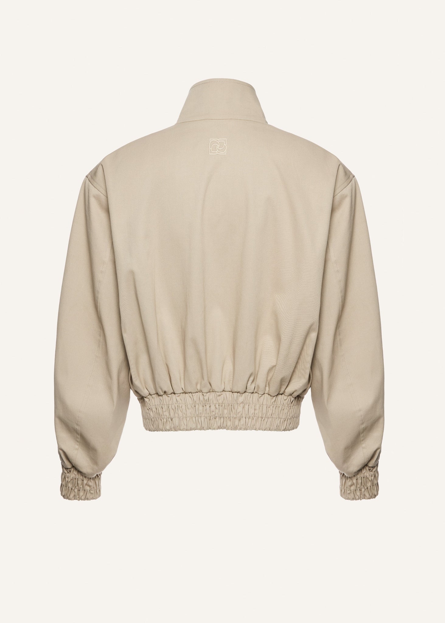 A cropped bomber jacket, featuring a high stand collar with tab closure and detachable shoulder pads. Designed with slanted front pockets cut along the seam, elasticated cuffs and hem, and subtle logo embroidery at the back. Finished with a front zip closure for an effortlessly structured look.