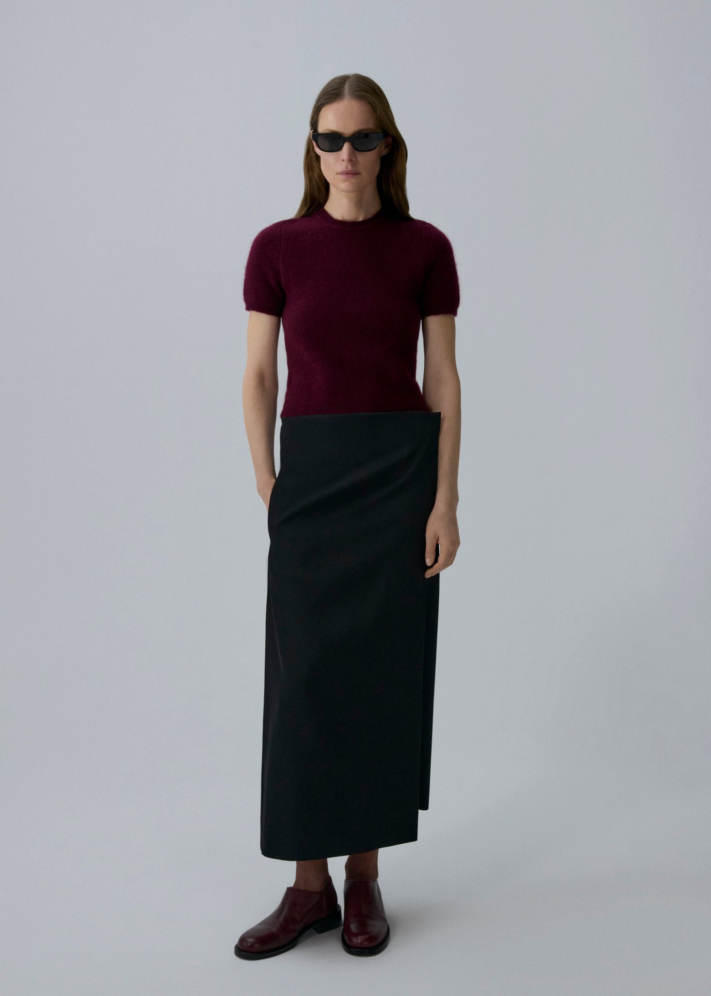 This mohair-blend knit top offers a cozy yet refined take on a wardrobe essential. The short sleeves and cropped silhouette make it ideal for layering or wearing solo. Designed with a classic crew neckline and ribbed trims for a clean finish.