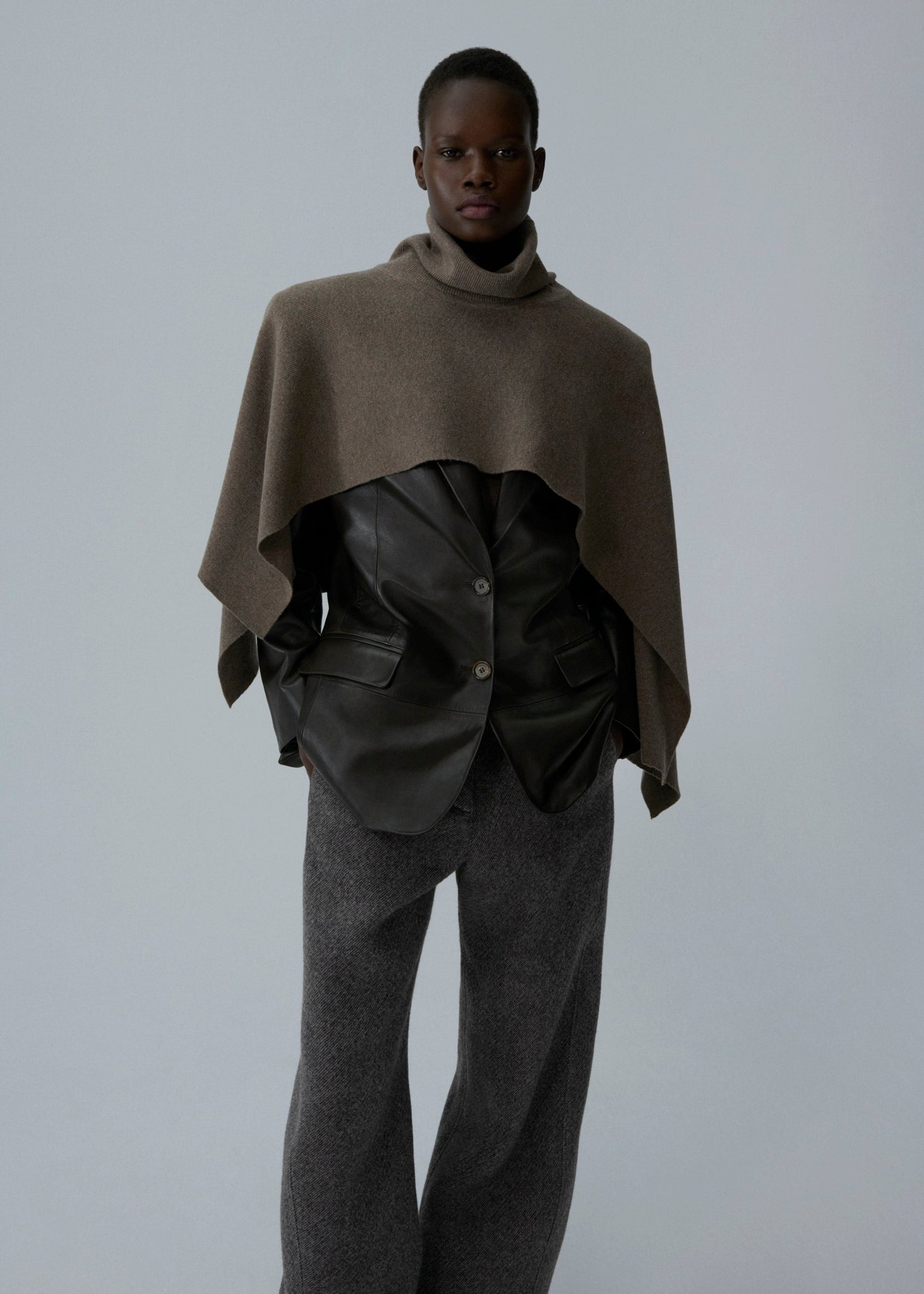 A modern knit top crafted from soft wool, featuring an asymmetrical neckline with one long sleeve and one sleeveless side. This top comes with a cape.