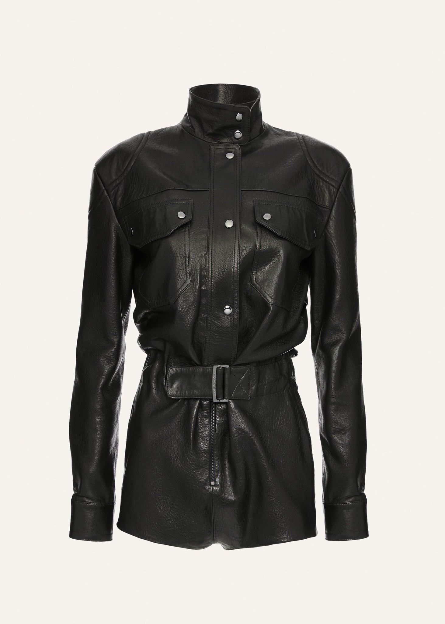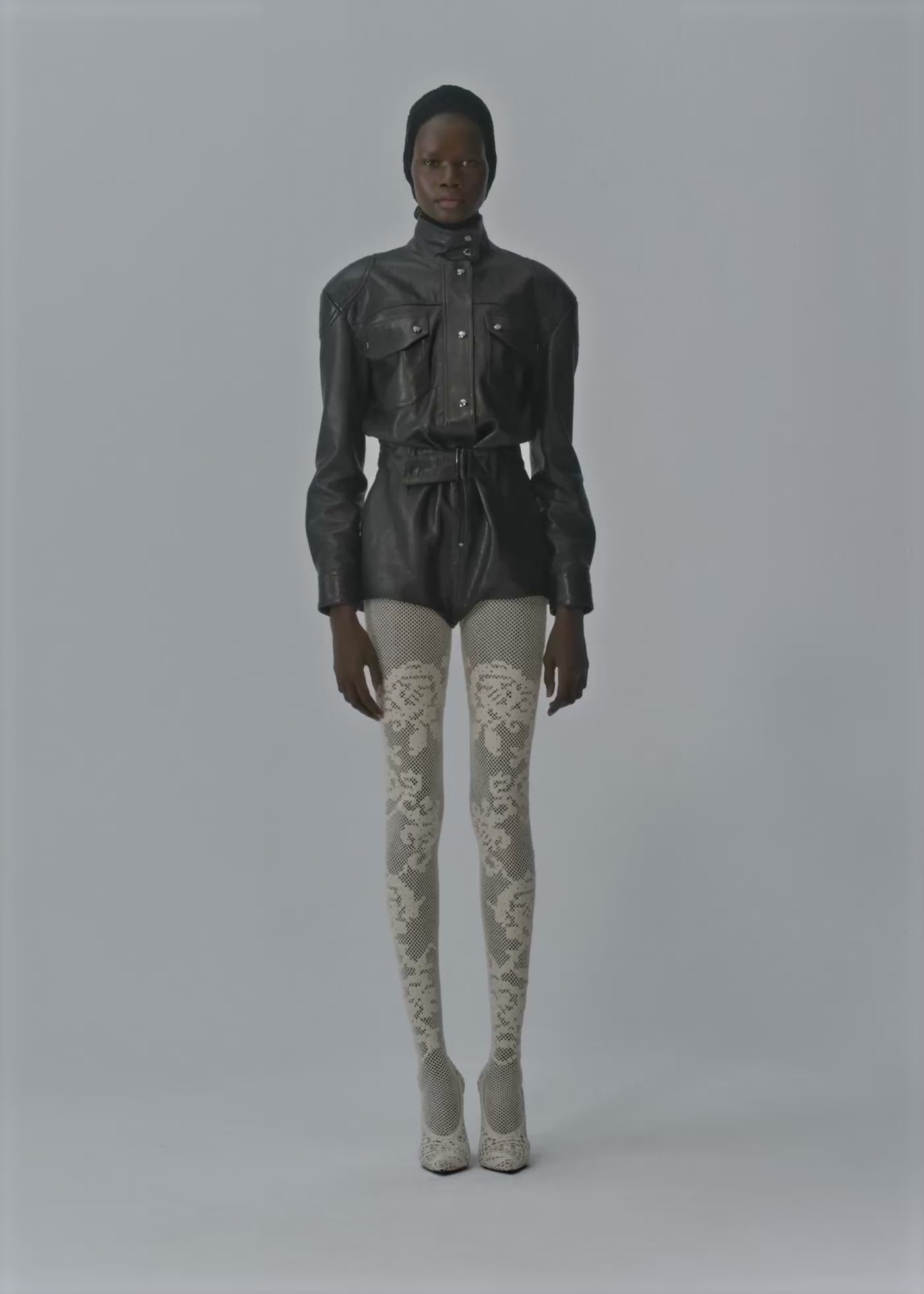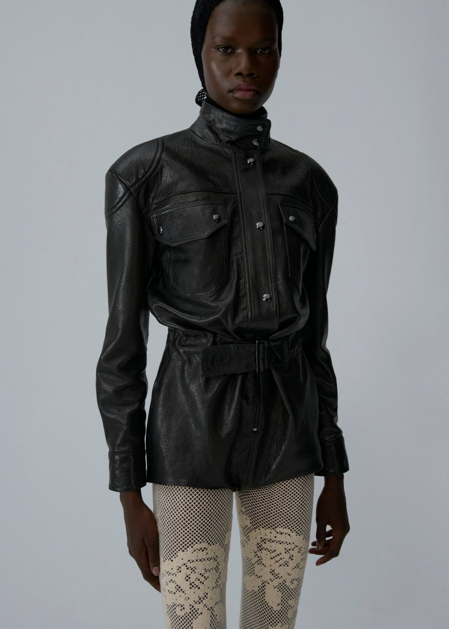 This black leather bodysuit is tailored with a high neck, structured shoulders, and front flap pockets for a modern utility edge. The silhouette cinches at the waist with an integrated belt, creating a flattering, contoured fit. Snap button closures and paneled construction enhance the powerful and sexy look.