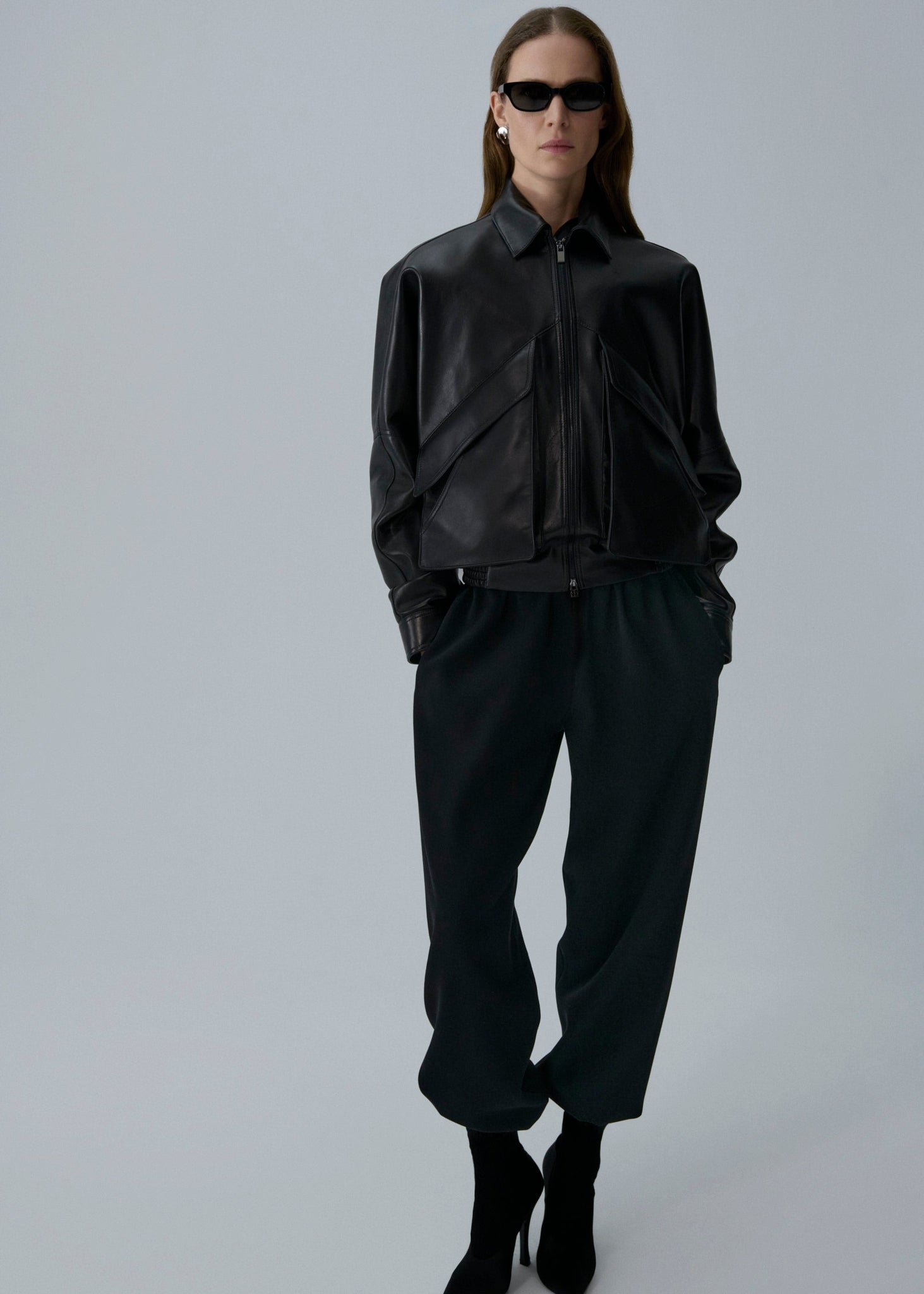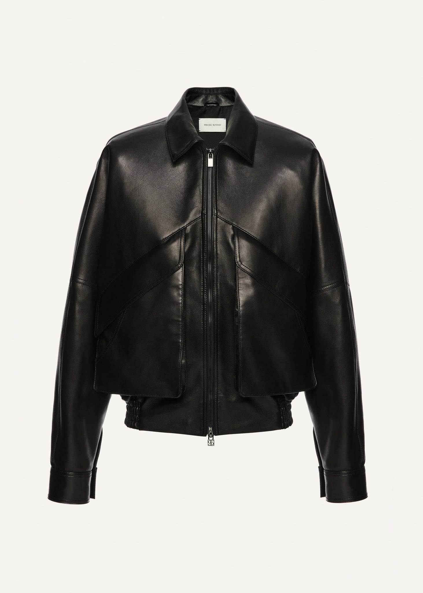 Leather bomber jacket with a sharp design. Crafted from smooth black leather, it features exaggerated slanted flap pockets.The silhouette is cinched at the hem with an elastic band for a tailored fit. Full zip closure, structured collar, and snap-button cuffs. Reimagination of the classic bomber in an architectural form.
