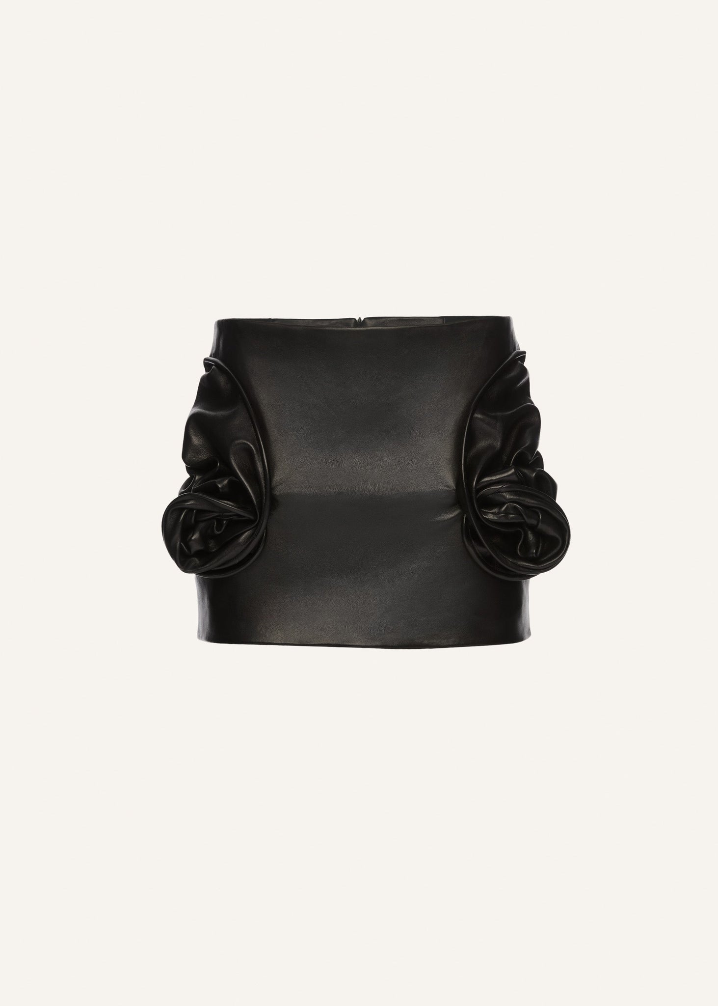 A low waist leather mini skirt with rose appliqués at the hips.