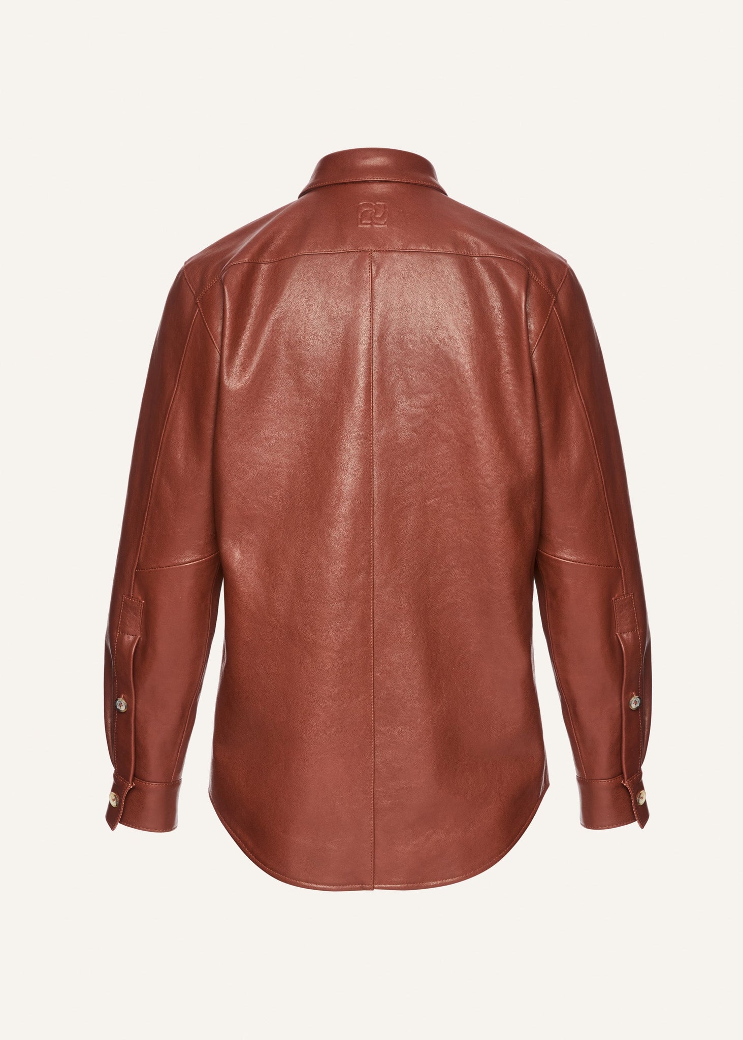 A modern take on a wardrobe classic, this button down shirt is crafted from supple leather with a soft sheen finish. The minimalist design features a pointed collar, tonal stitching, and natural buttons, offering a sleek yet relaxed silhouette. An embossed logo at the back adds a subtle signature detail. Wear it as a shirt or layered open as a lightweight jacket.