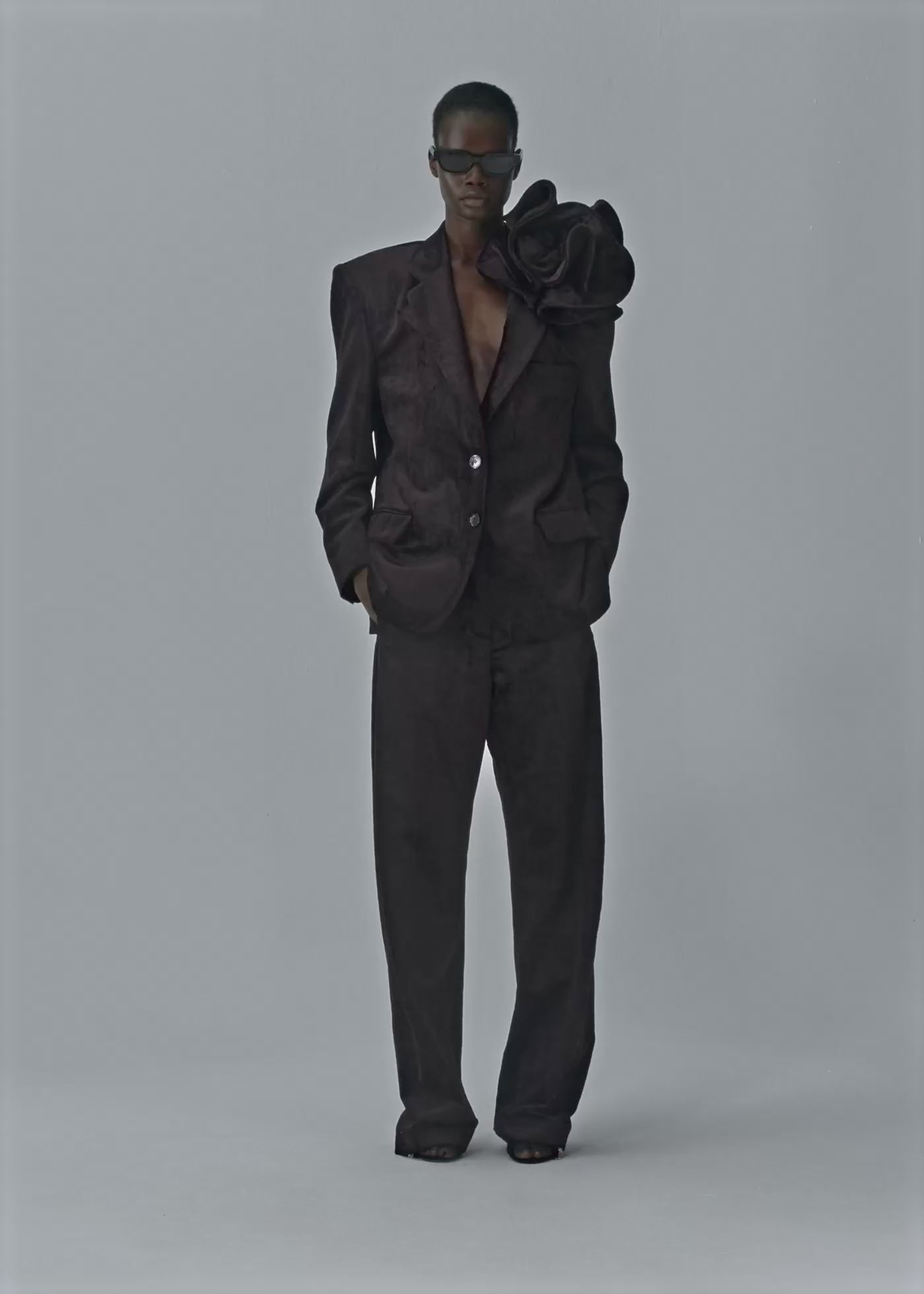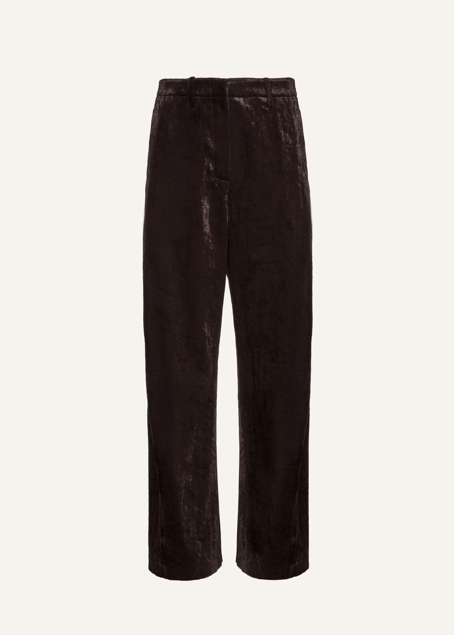These tailored trousers feature a wide-leg silhouette with side seams shifted toward the front, creating a refined shape. Designed with front welt pockets and single-button back pockets, they have a dropped waistline. The rear belt loops are shaped into an "M" motif for a signature finish.