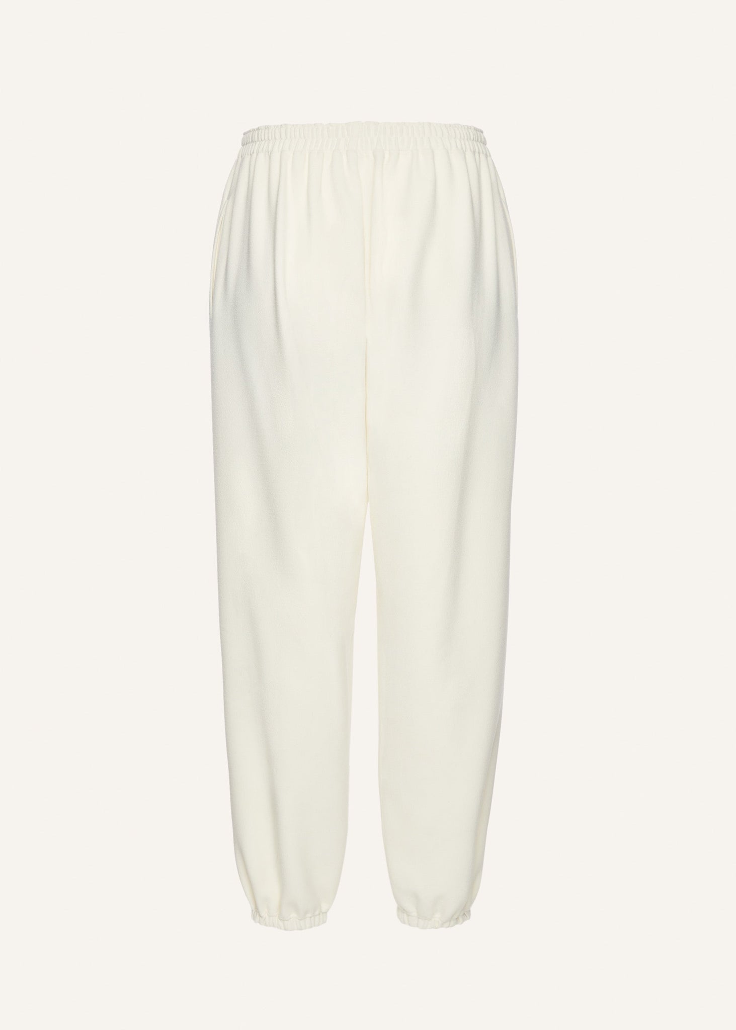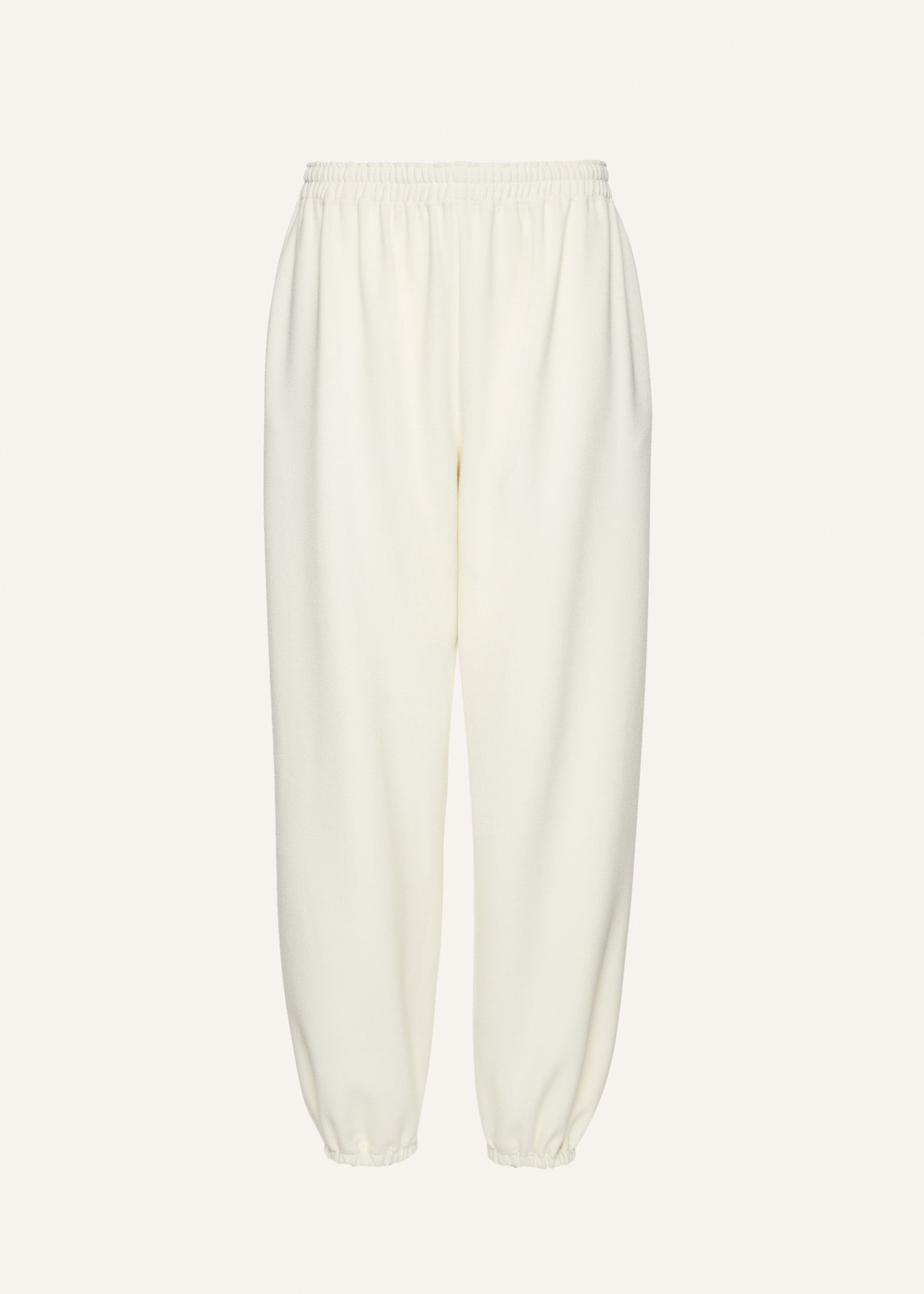 These relaxed trousers feature a seamless side construction for a clean silhouette. The elastic waistband is finished with an internal decorative drawstring, while welt pockets sit at the front sides. The legs are softly gathered at the ankles with elastic cuffs.