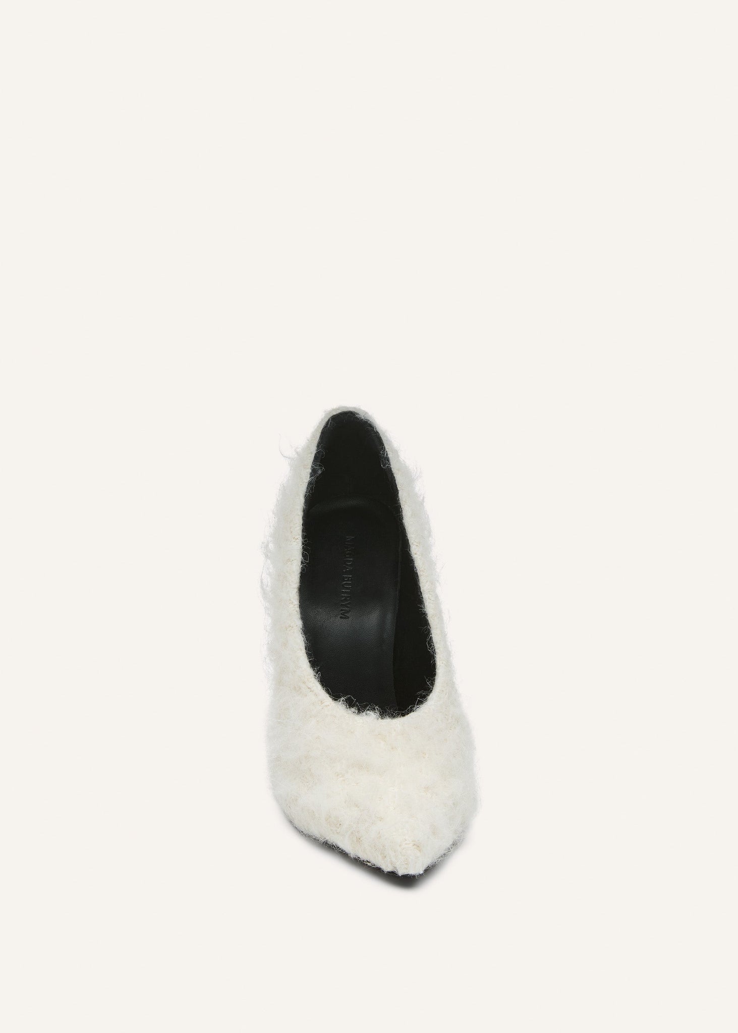A tactile evolution of the sculptural pump, this pair is crafted with a hand-loomed upper in elevated texture. The pointed toe and curved architectural heel remain refined and structured, creating a striking contrast to the organic finish of the woven surface. Heel height is 11,5 cm.