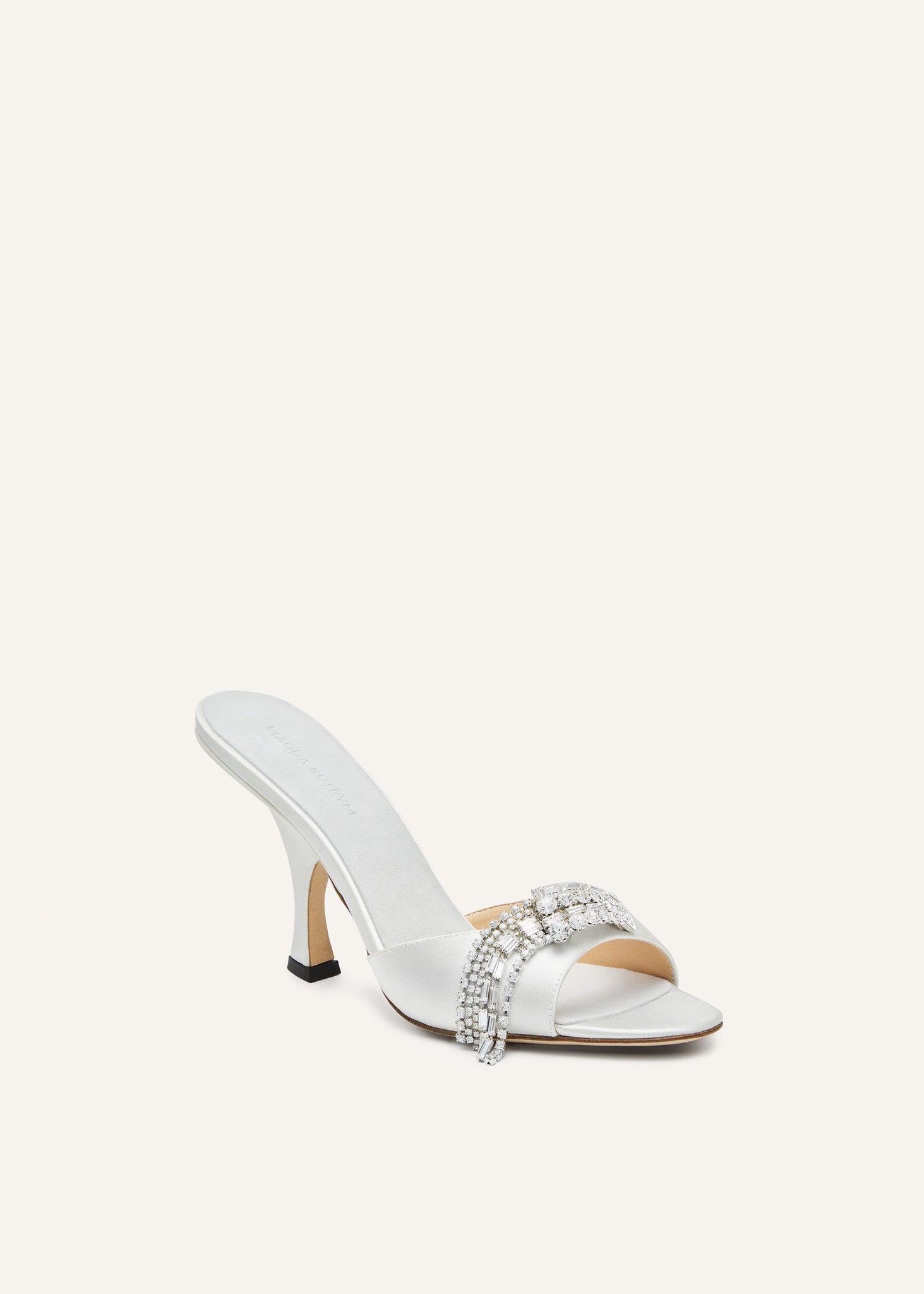 These sculptural mules feature a curved heel and open toe silhouette for a bold, feminine profile. A crystal-encrusted buckle at the strap cascades into strands of rhinestone fringe, adding movement and sparkle with every step. Made in Italy, this glamorous design is a standout accessory for evening wear or statement day looks. Heel height is 10 cm.