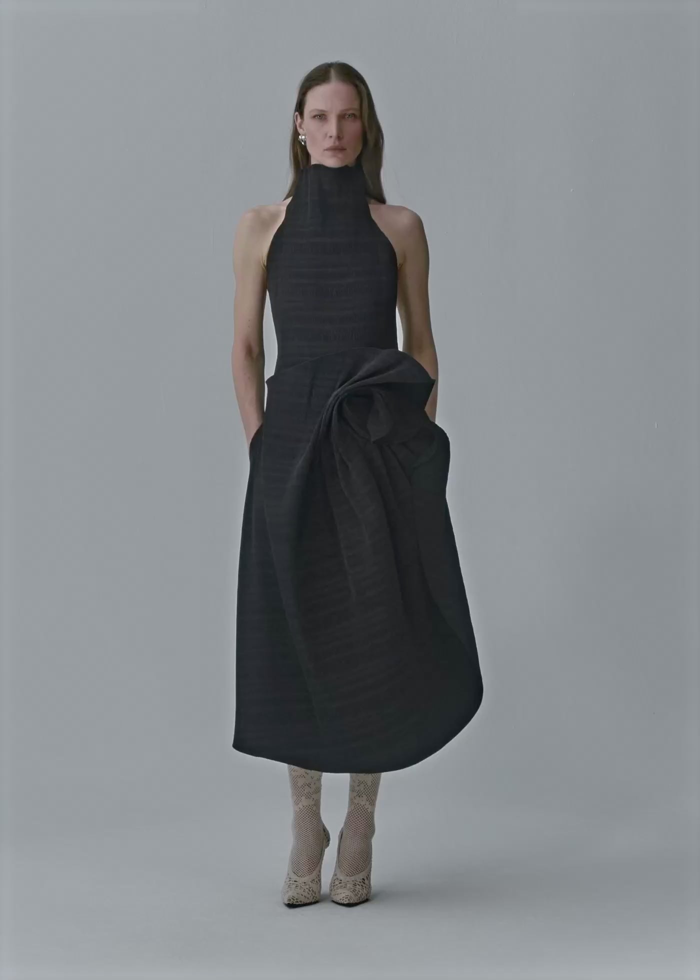 Halter top made from fine plissé fabric. It features an open back and a high neckline finished with a narrow stand collar. The collar fastens at the back with fabric-covered buttons. Designed to be slipped on over the head, this piece offers a sleek silhouette with rich texture and modern minimalism.