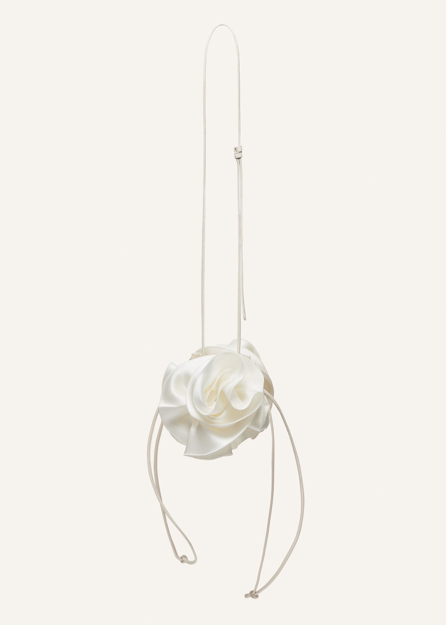 The Magda bag is Magda Butrym's iconic handbag: a bucket bag adorned with large 3D roses on either side of the body. The classic silk version has a satin body and flowers. This limited edition has an additional pearl handle, so that the wearer can choose between a pearl handle or a detachable classic leather crossbody strap.