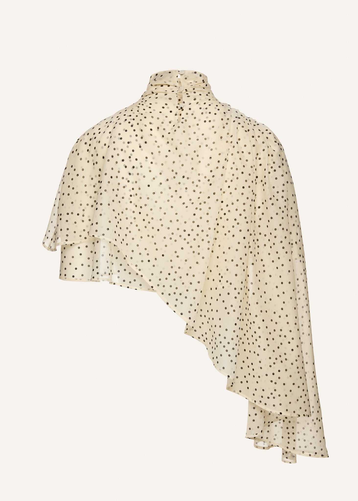 Crafted from layers of sheer silk, this high-neck blouse has an asymmetrical cropped hemline with flowing sleeves and body for a romantic look.
