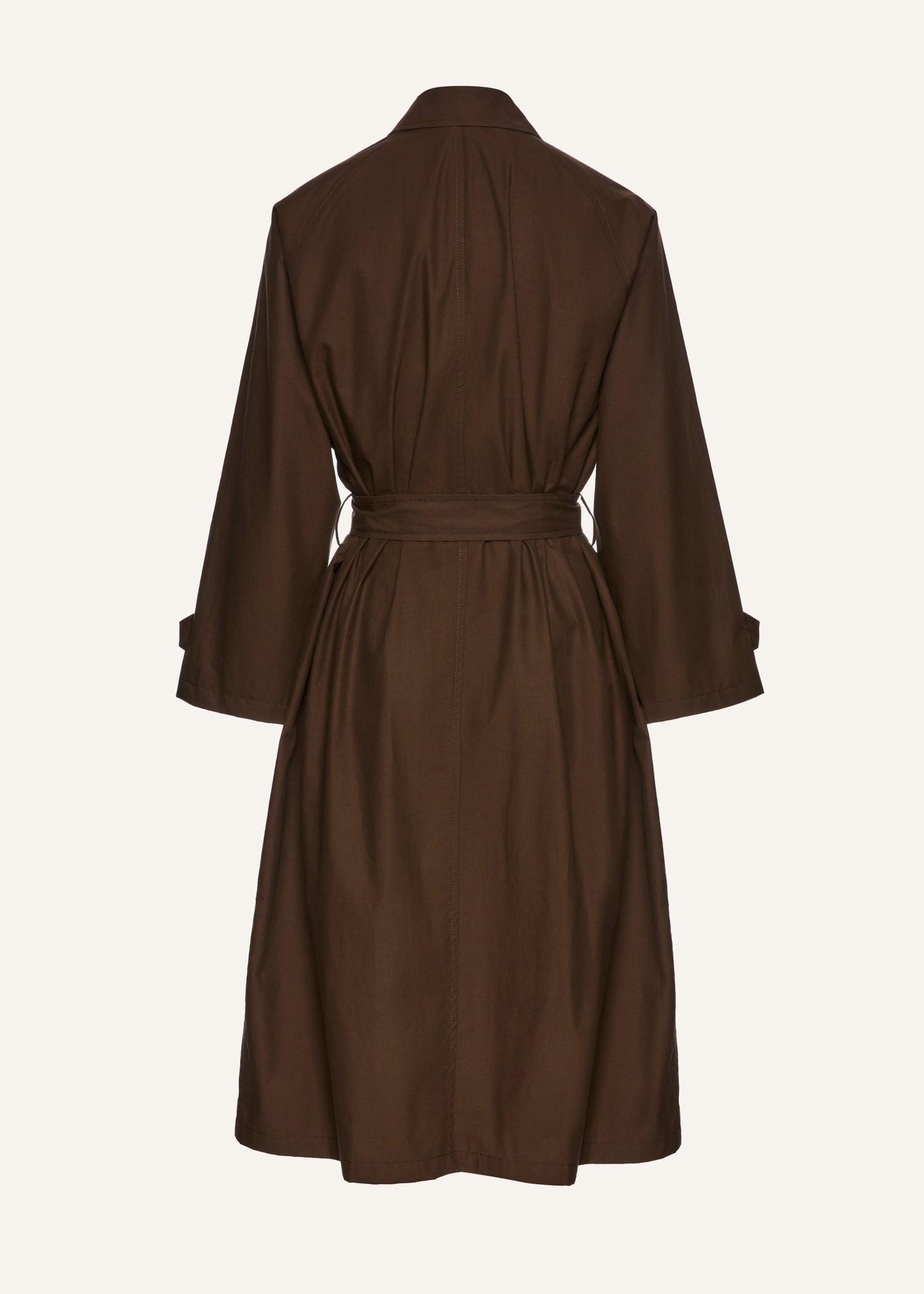 A lightweight cotton trench coat with a single button closure at the neck, classic folded collar, and belted waist closure. Comes with a removable hood for a slavic inspired touch.