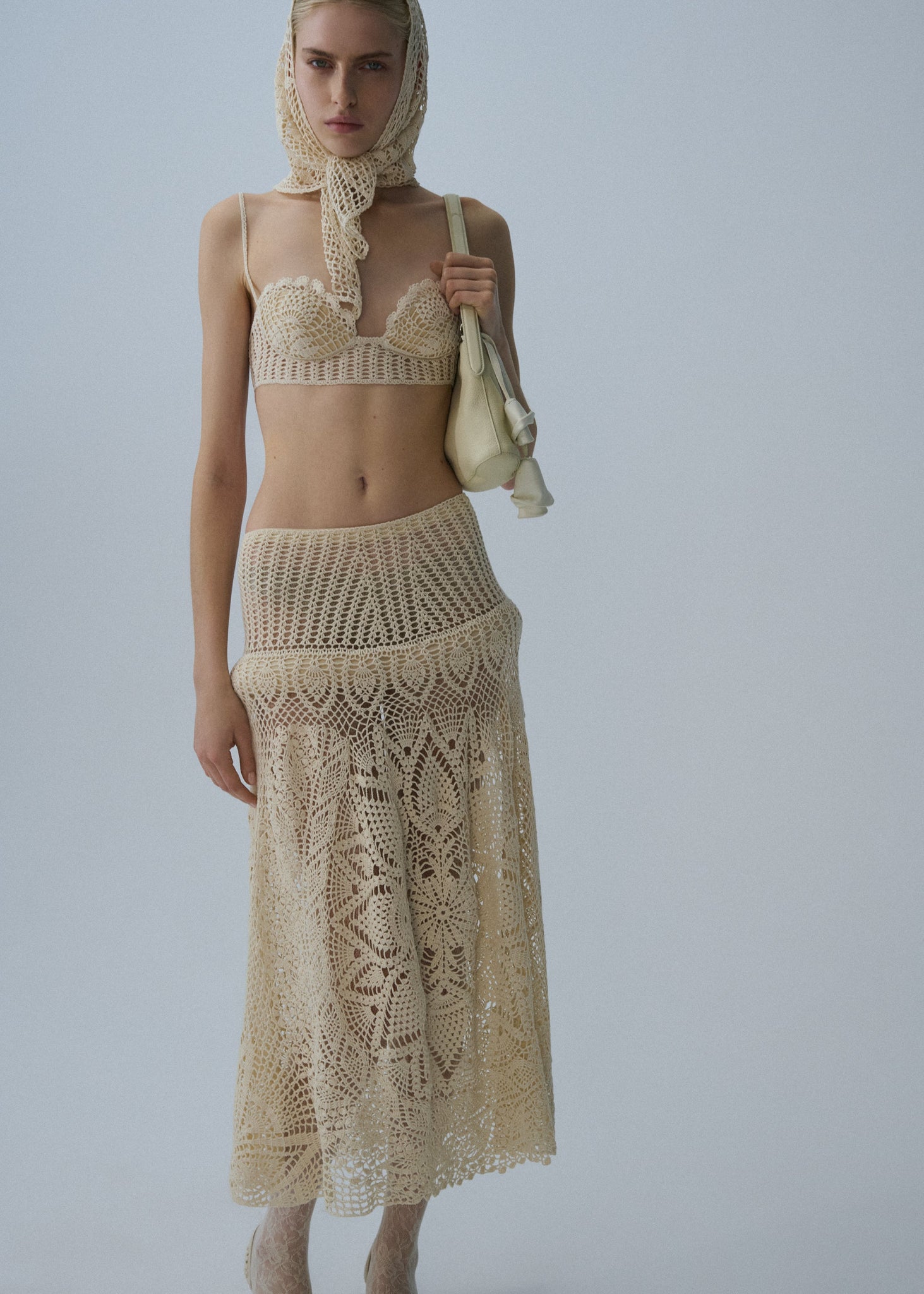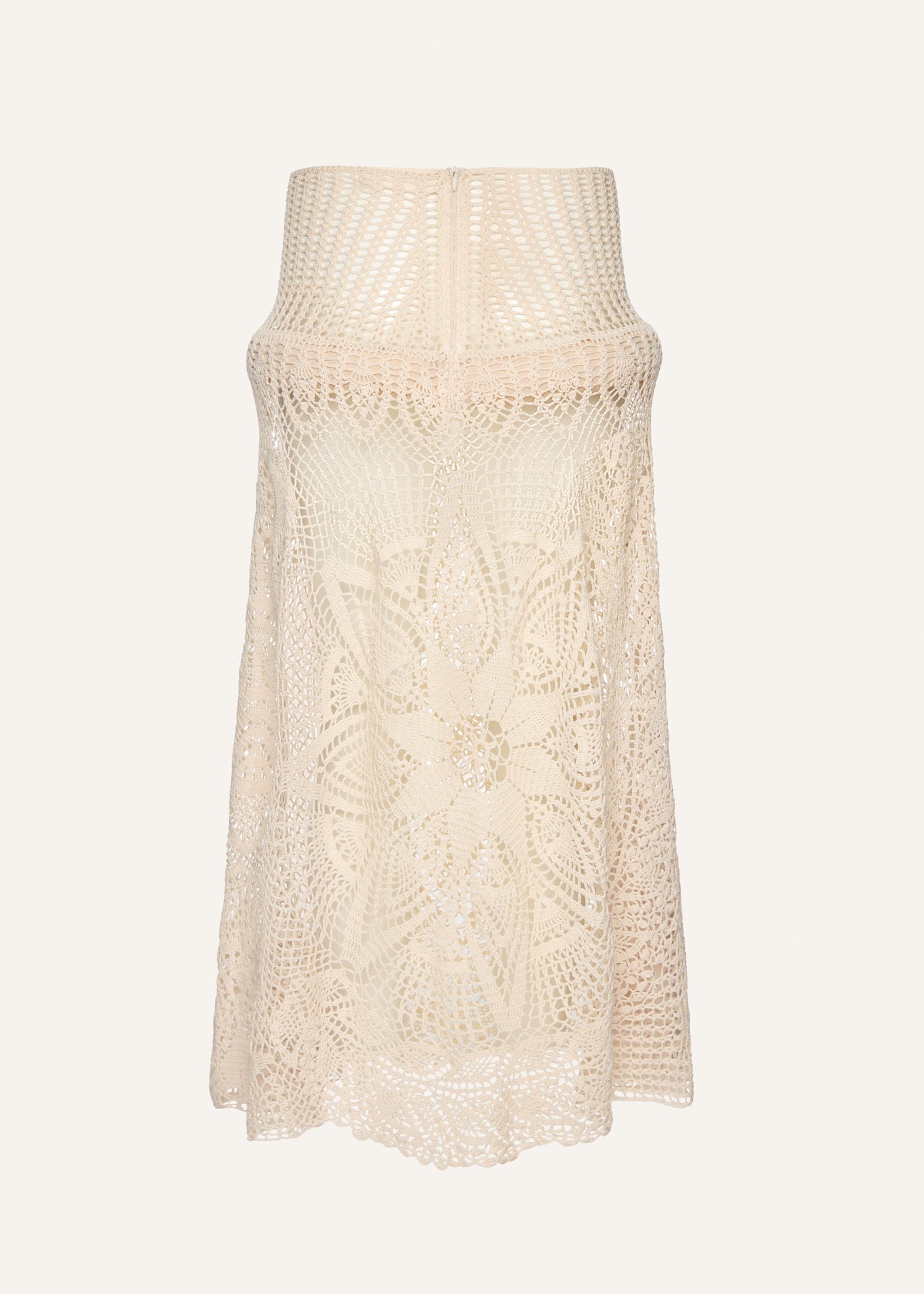 Employing Magda Butrym's signature handmade lace crochet technique, this drop-waist skirt emphasizes a seasonal shape as a beautiful work of craftsmanship.