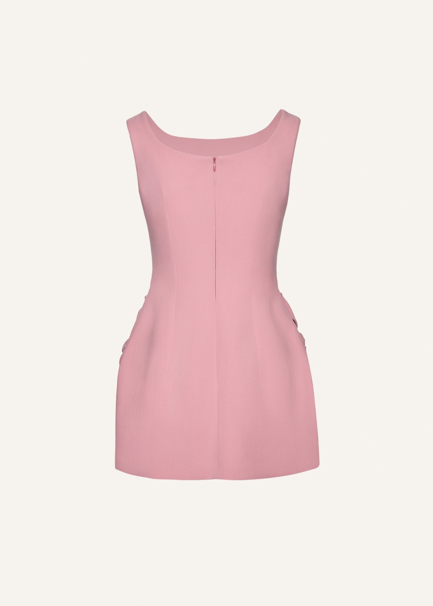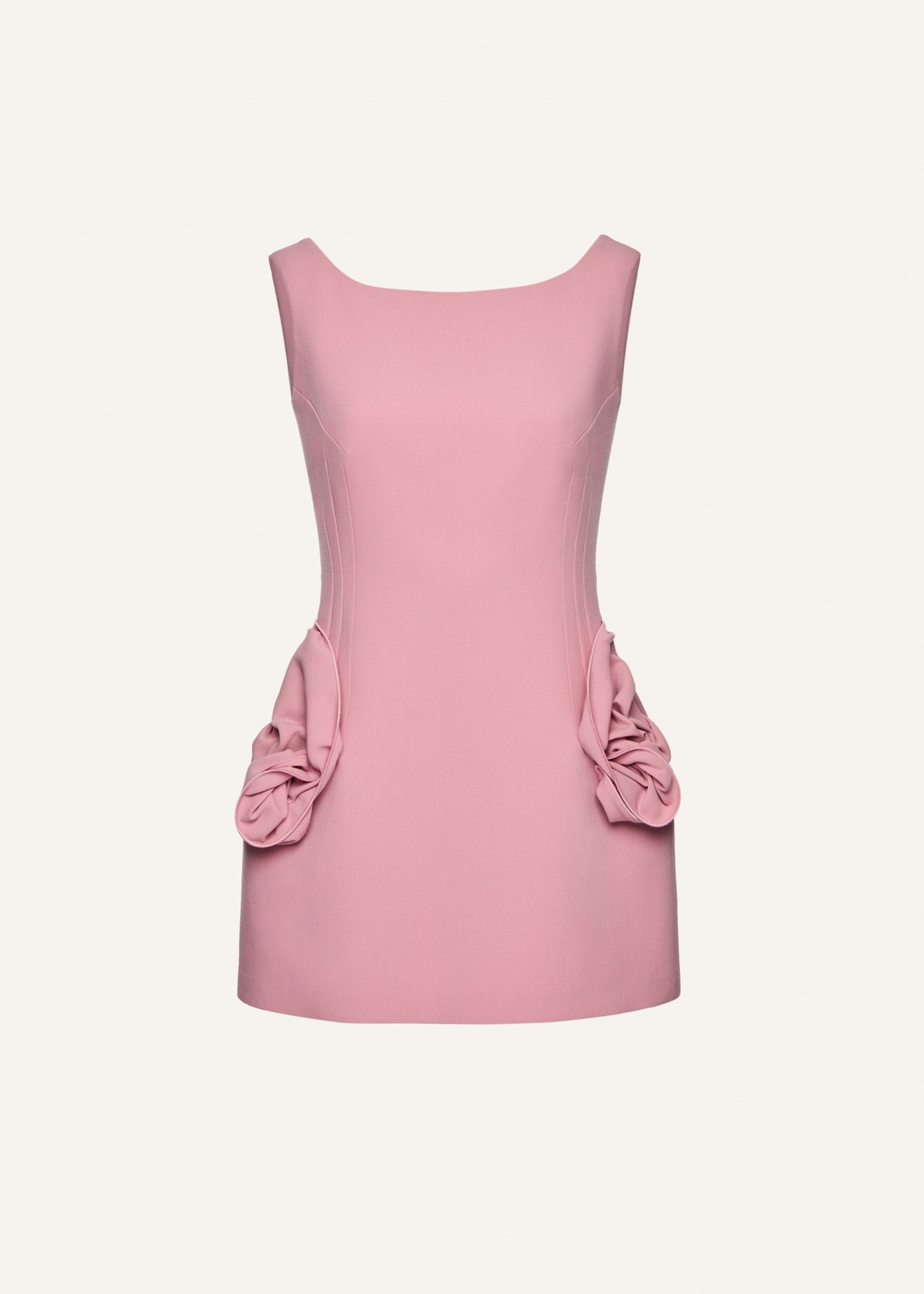 A fitted sheath mini dress with a structured shape offering a subtly flared skirt with rose appliqué detailing at the hips and a high-neckline.