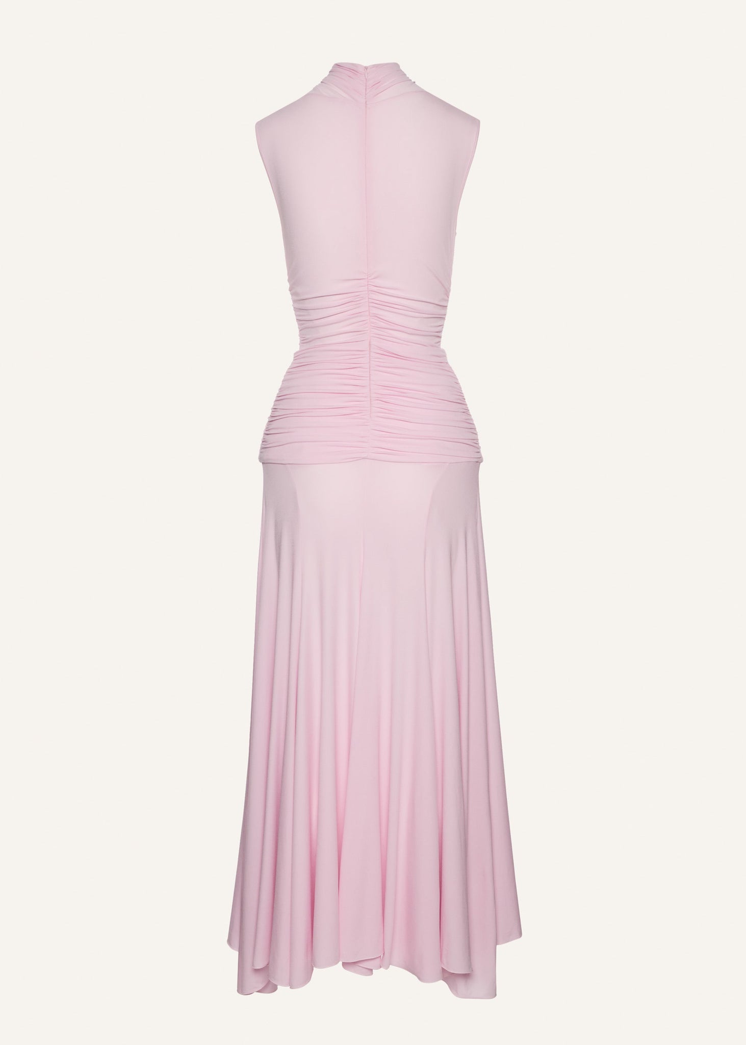 This sheer maxi dress has a fitted high-neck bodice and flowy midi skirt, complete with ruching at the waist to create an elongated drop-waist effect. Comes with an undergarment.
