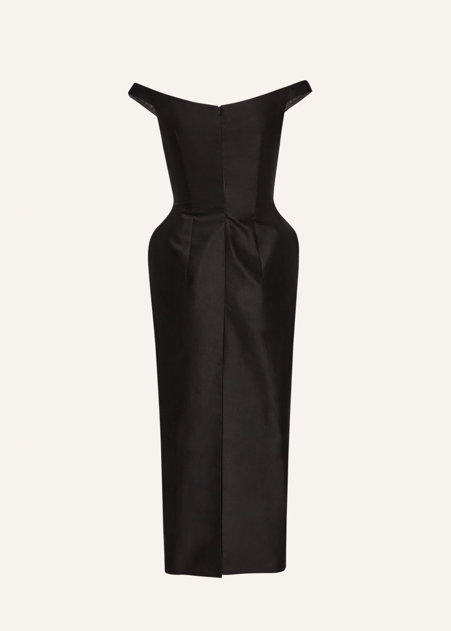 This ladylike midi dress is made from lightweight cotton fabric and creates an hourglass shape by using hip pads and a fitted bodice, complemented by a rounded off-shoulder neckline.