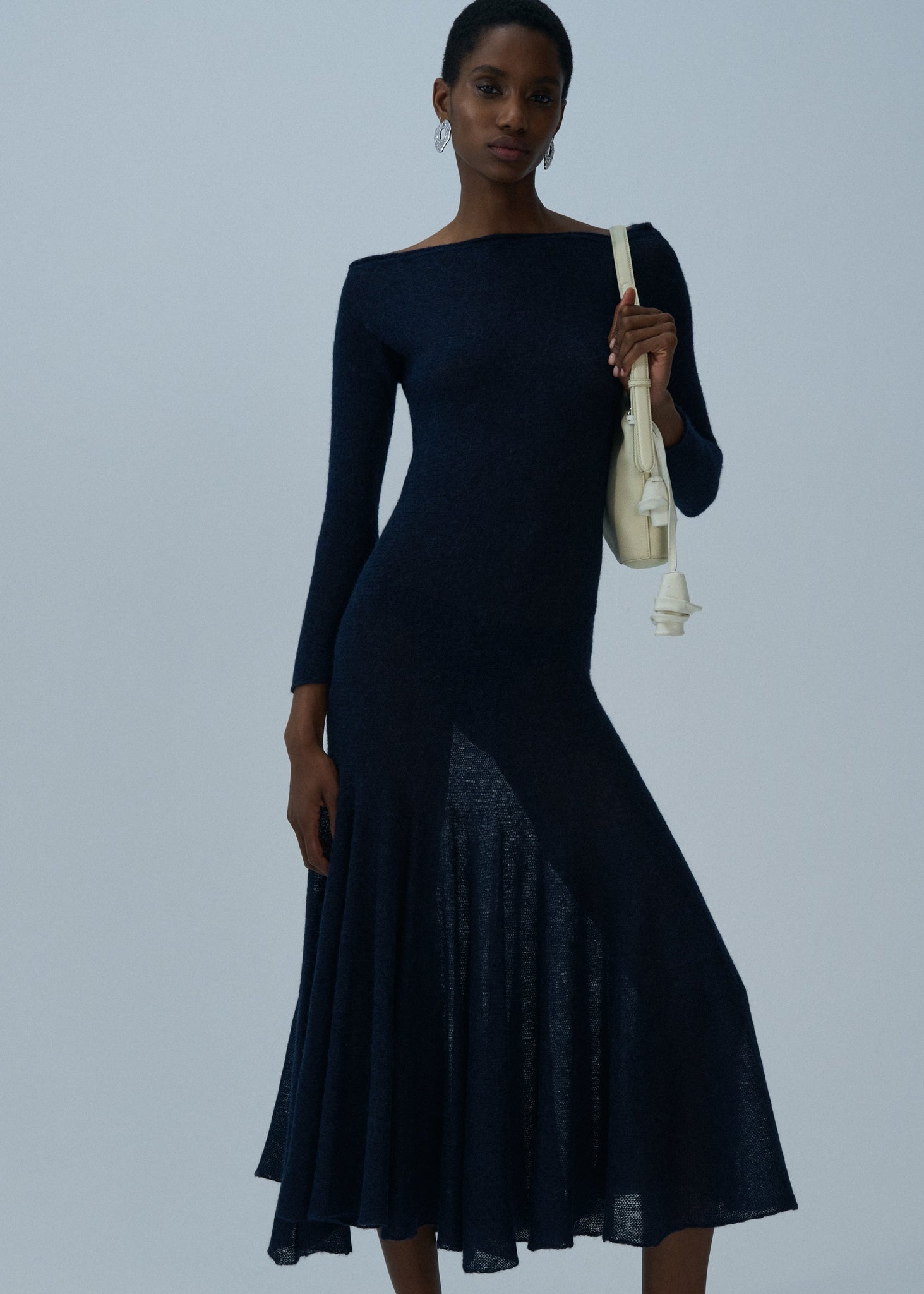 Crafted from a fine alpaca blend, this knitwear dress has long sleeves, a round neck and a drop-waist giving way to a flared circle skirt.