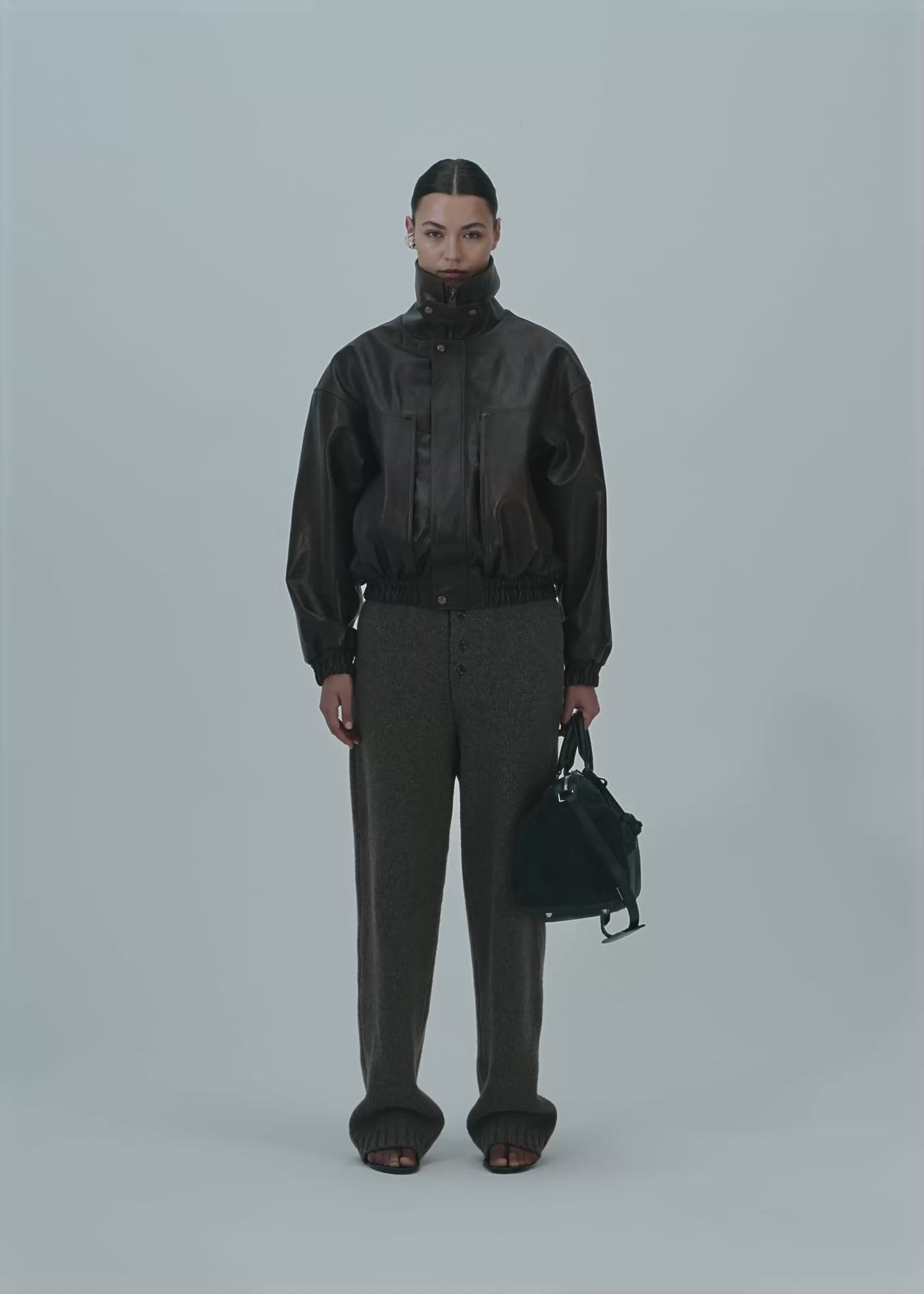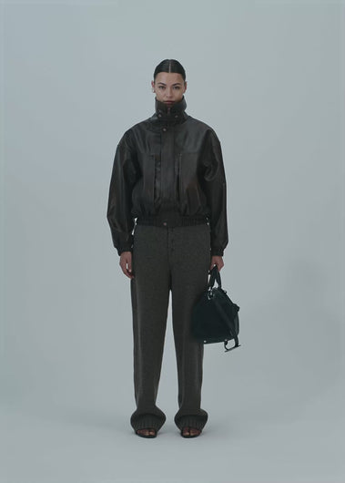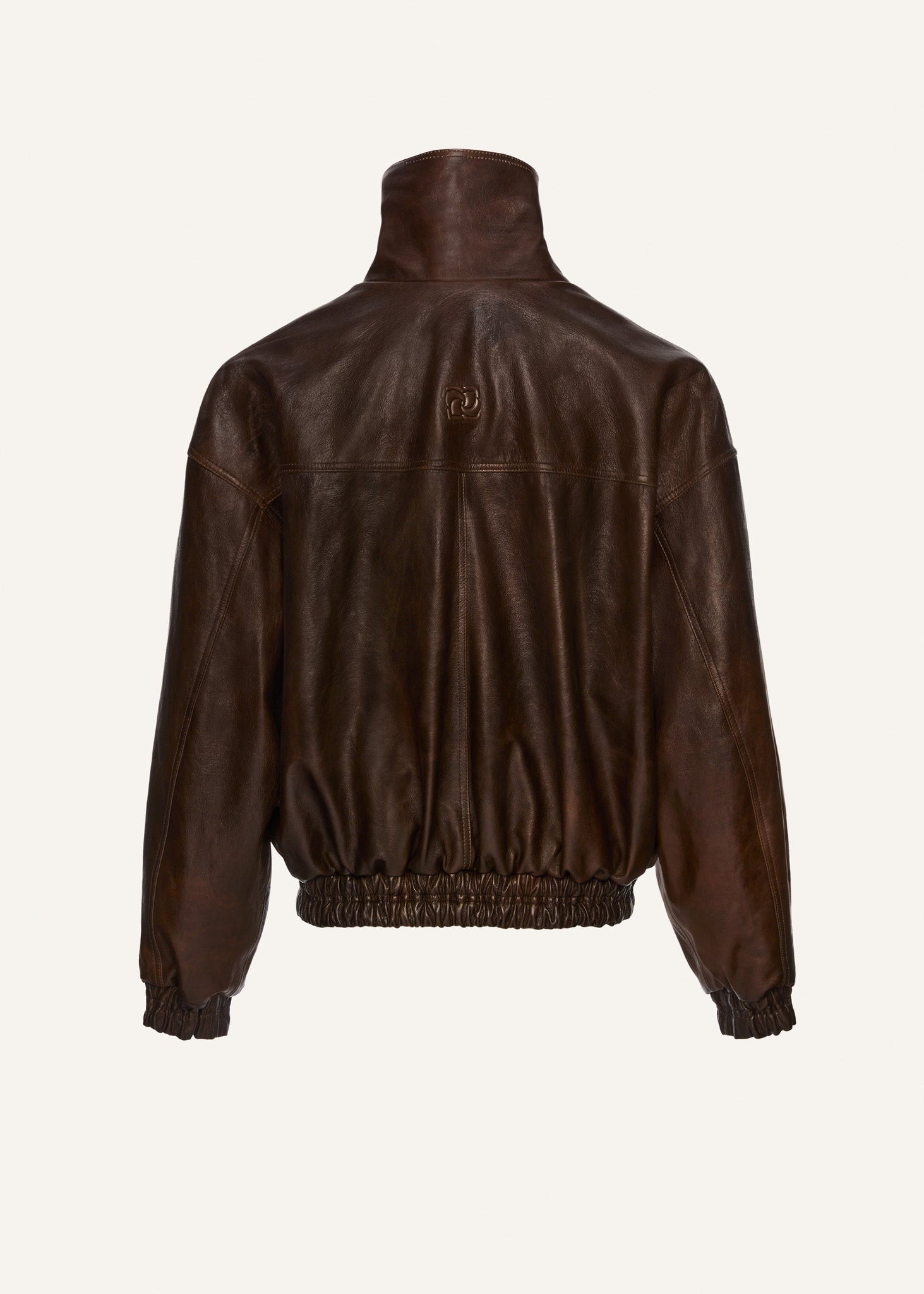 An oversized bomber jacket with a zip-front and a snap-collar closure.