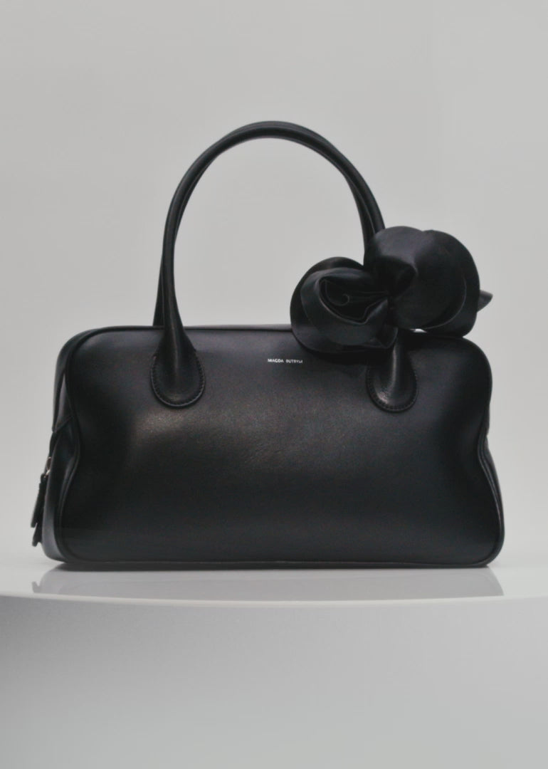 Introducing the Brigitte handbag. Inspired by the nostalgia of 90's while deeply rooted in Magda's family heritage. Its elegant silhouette, the roomy interior, two top handles and top zipper have been thoughtfully crafted in Italy. Adding a touch of on-brand dreaminess is the leather flower embellishment. Meticulously arranged and fixed onto the bag's handle. For an ideal finish curl the flower petals outward for a blooming rose effect on your bag.
