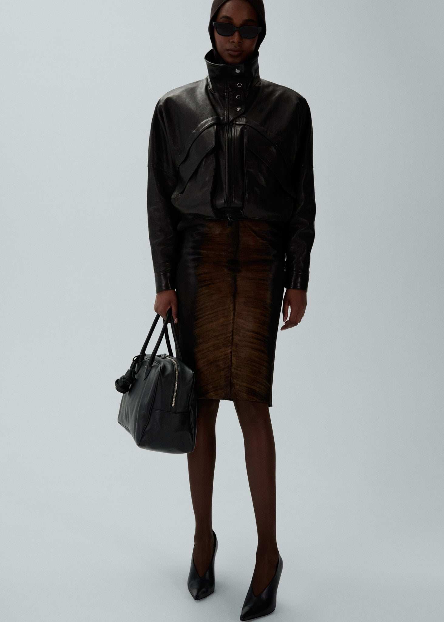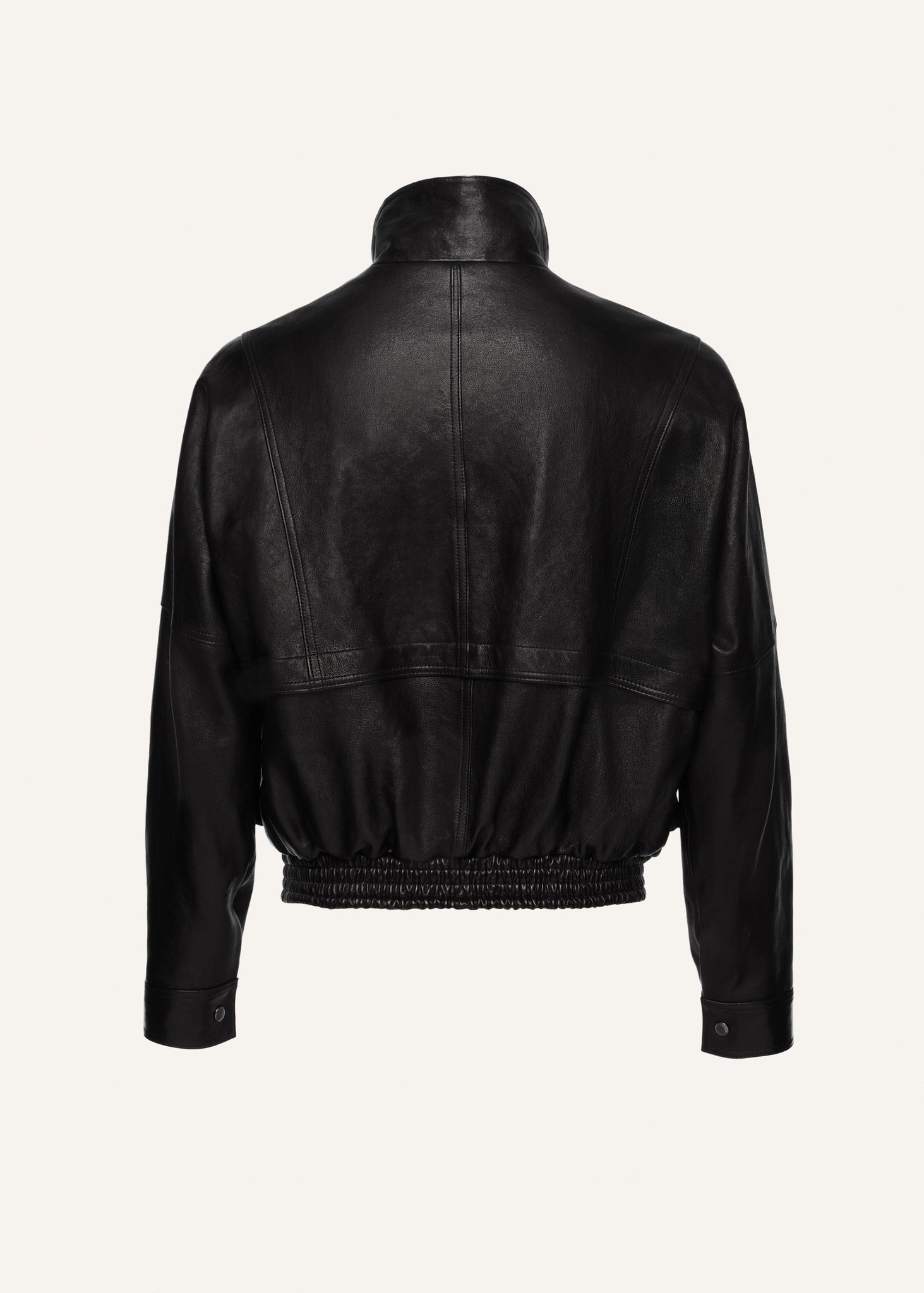 An oversized leather jacket with a vintage appeal, featuring sloping shoulders, a cinched elastic waistband, zip and button closures, and oversized front flap pockets for a classic bomber look.