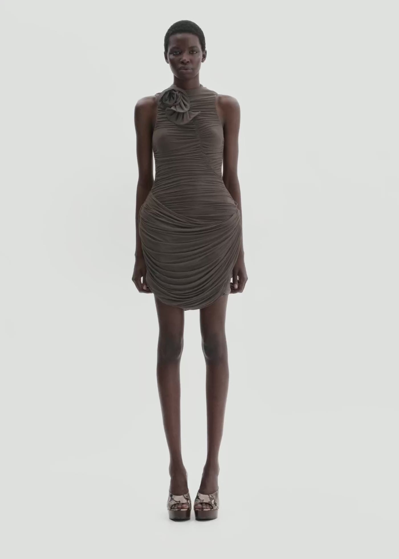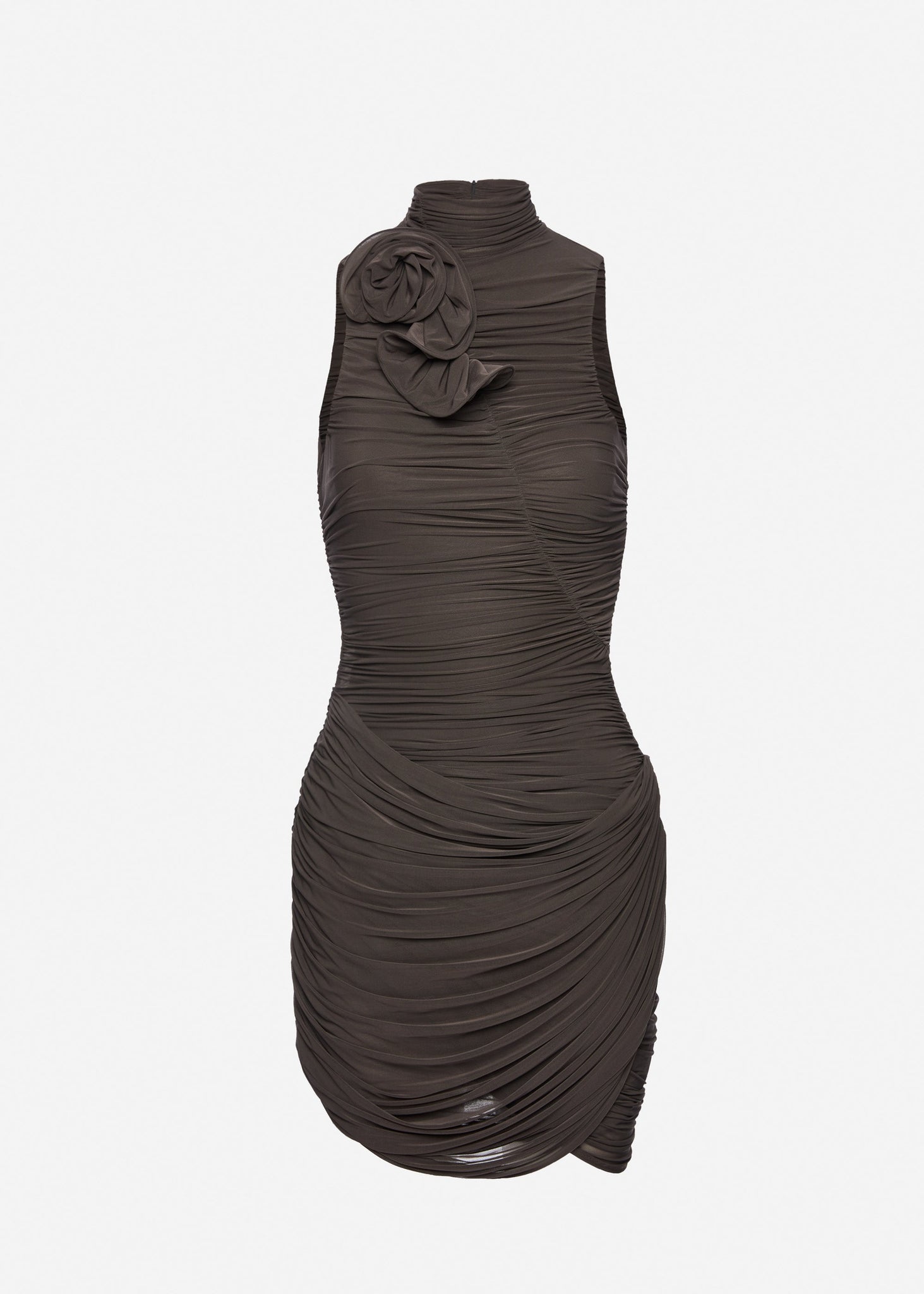 A figure-hugging mini dress with a ruched high neckline and sculptural detailing throughout. A handcrafted floral appliqué adorns the neckline, while additional draped overlays at the hips add volume and movement. Subtle padding accentuates the hips for a sculpted effect. Finished with a concealed back zip and an integrated bodysuit for a seamless fit.