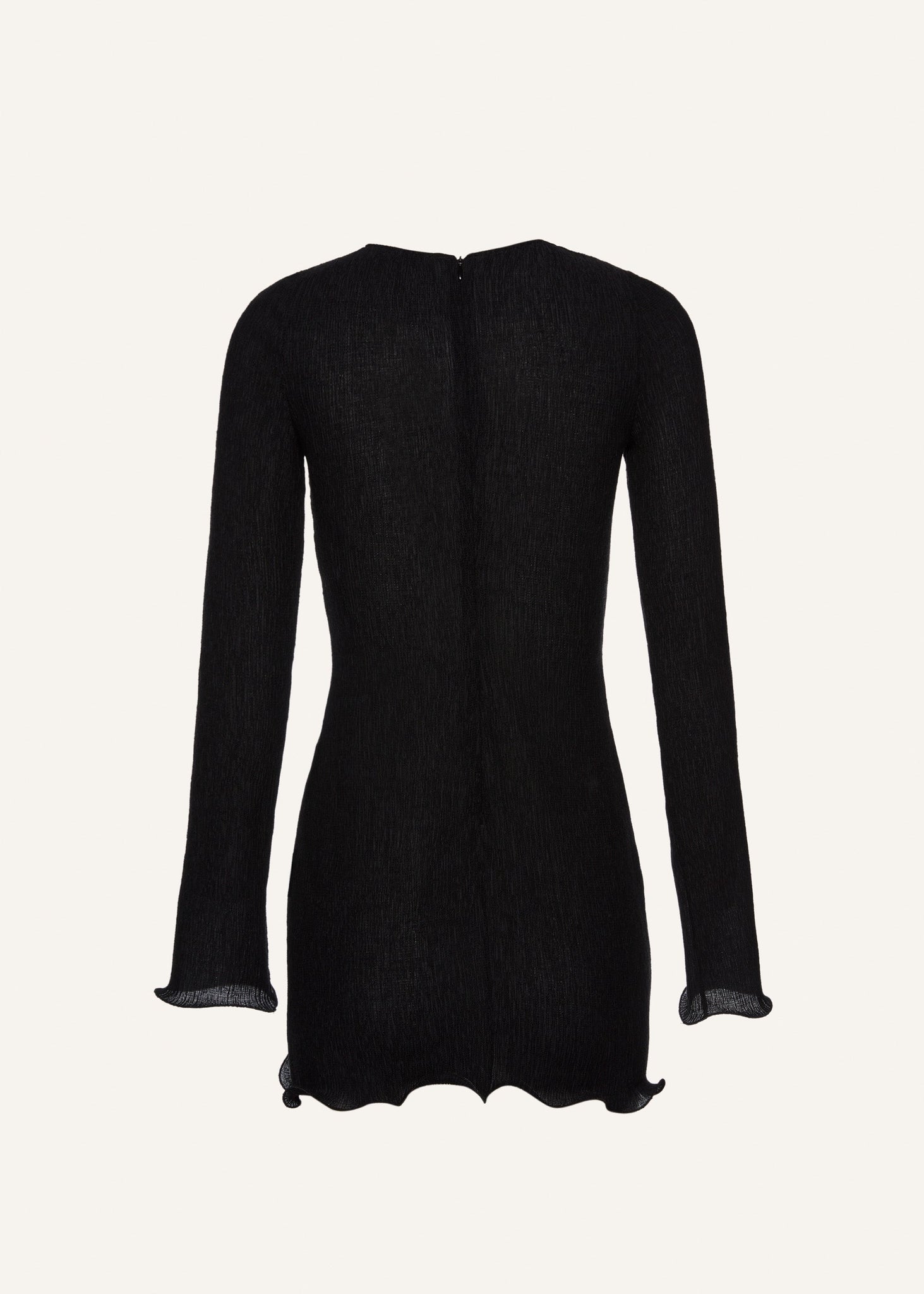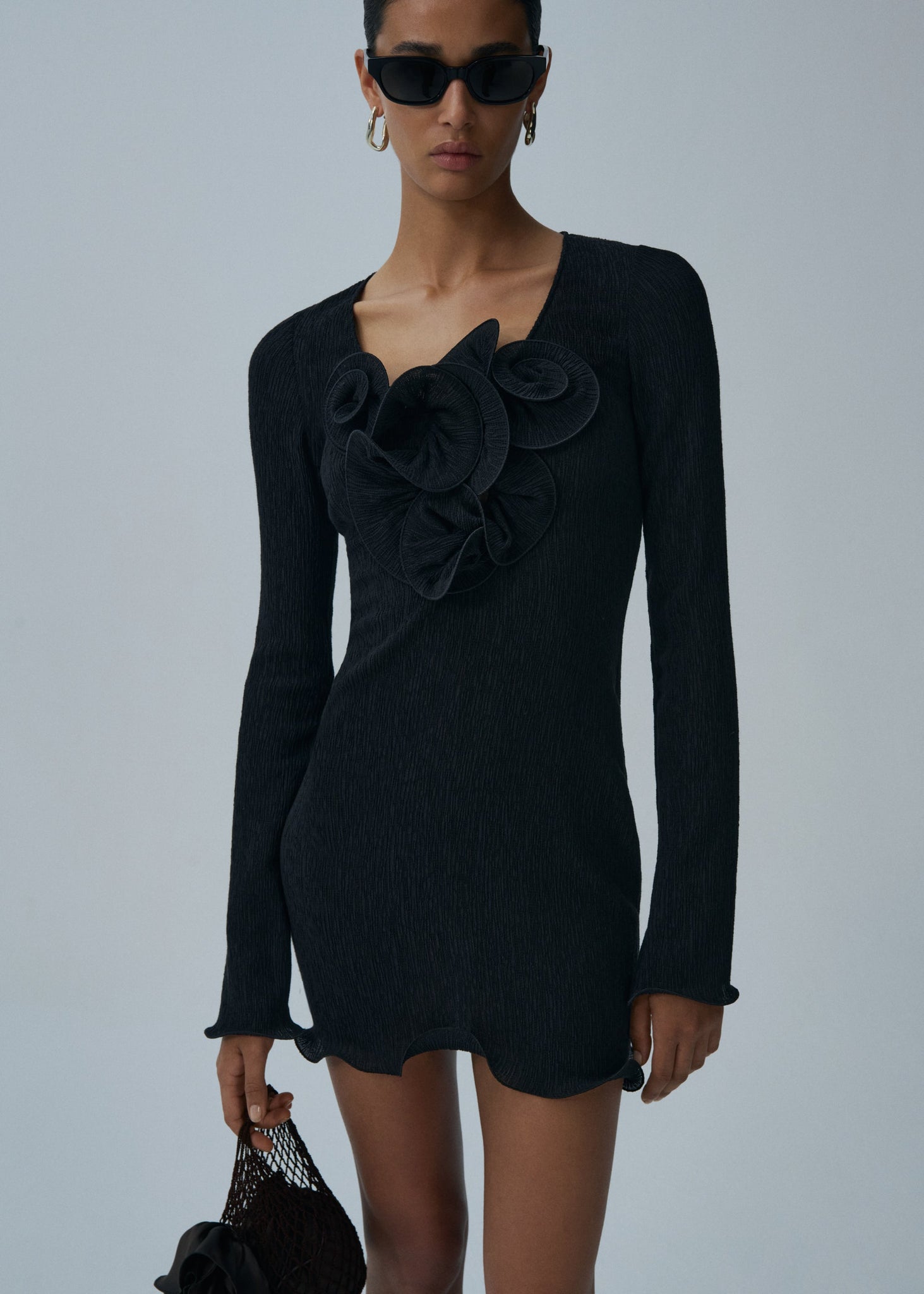 Magda Butrym’s beachwear offering includes a signature long-sleeve mini dress made from crepe fabric, with floral ruffle detailing at the chest to create a deep neckline.