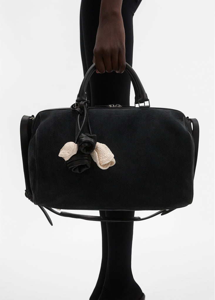 Handcrafted crochet rose charms attached to a sleek leather strap, designed as a delicate yet impactful accessory. These artisanal flowers bring a romantic touch to any look and are perfect for adding to a handbag, belt loop, or keychain. A signature blend of craftsmanship and romance.