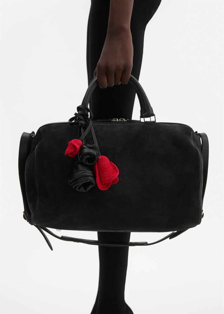 Handcrafted crochet rose charms attached to a sleek leather strap, designed as a delicate yet impactful accessory. These artisanal flowers bring a romantic touch to any look and are perfect for adding to a handbag, belt loop, or keychain. A signature blend of craftsmanship and romance.