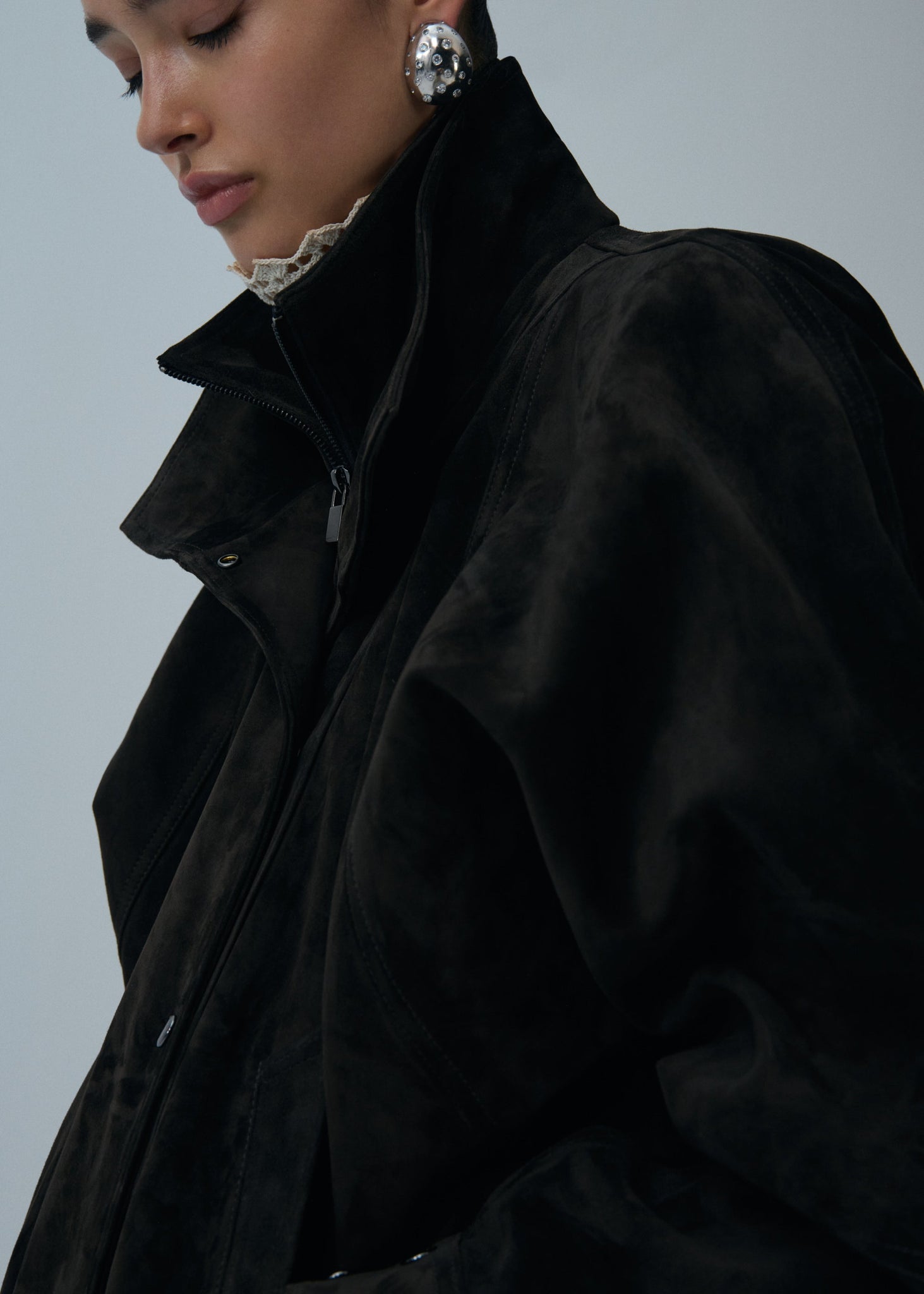 A longline jacket, cut from supple suede, with a cinched waist for a peplum effect. The jacket features a double snap button closure and a foldable high neck.